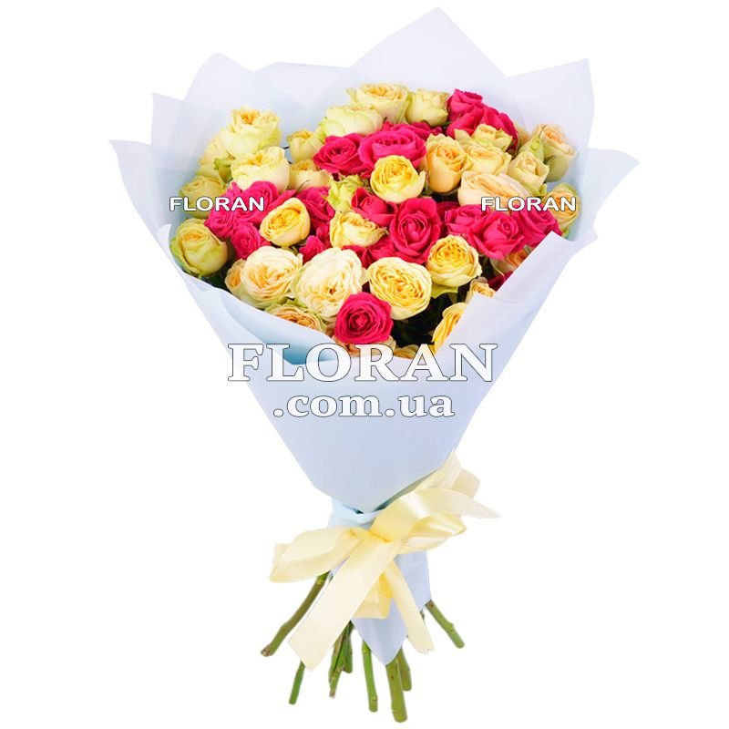 15 sprigs of spray peony-shaped roses - product code FL-1395. Bouquet of 15 branches of spray peony rose is a great combination of 15 yellow and pink spray roses. This bouquet is the epitome of beauty and sophistication. Shrub peony roses are distinguished by their magnificent shape and lush flowers. Their petals have a delicate and sophisticated hue that enhances their natural beauty. In this bouquet, each rose will shine with its own special charm, creating a unique atmosphere. Yellow and pink shades of roses complement each other, creating a harmonious combination of colors. Yellow symbolizes joy, sunshine and energy, while pink is associated with tenderness, romance and femininity. This bouquet of 15 yellow and pink spray roses is the perfect gift for a special occasion or to express your feelings and attention to your loved one. The packaging of this bouquet gives it a finished look and protects the roses during delivery. It emphasizes the beauty and value of each rose, giving the bouquet elegance and presentability. This bouquet of 15 branches of a spray peony rose will not only be a visual treat, but also a gift that will be remembered for a long time. It will delight the recipient with its beauty, uniqueness and aroma. A bouquet of yellow and pink spray roses will create a special atmosphere filled with joy and love. This bouquet is a wonderful way to express your feelings and wishes. It will become a symbol of your admiration and gratitude. Give this bouquet to a loved one, and he will feel your care and attention. A bouquet of 15 yellow and pink spray roses is the epitome of beauty and emotion that will remain in the recipient's heart for years to come.
