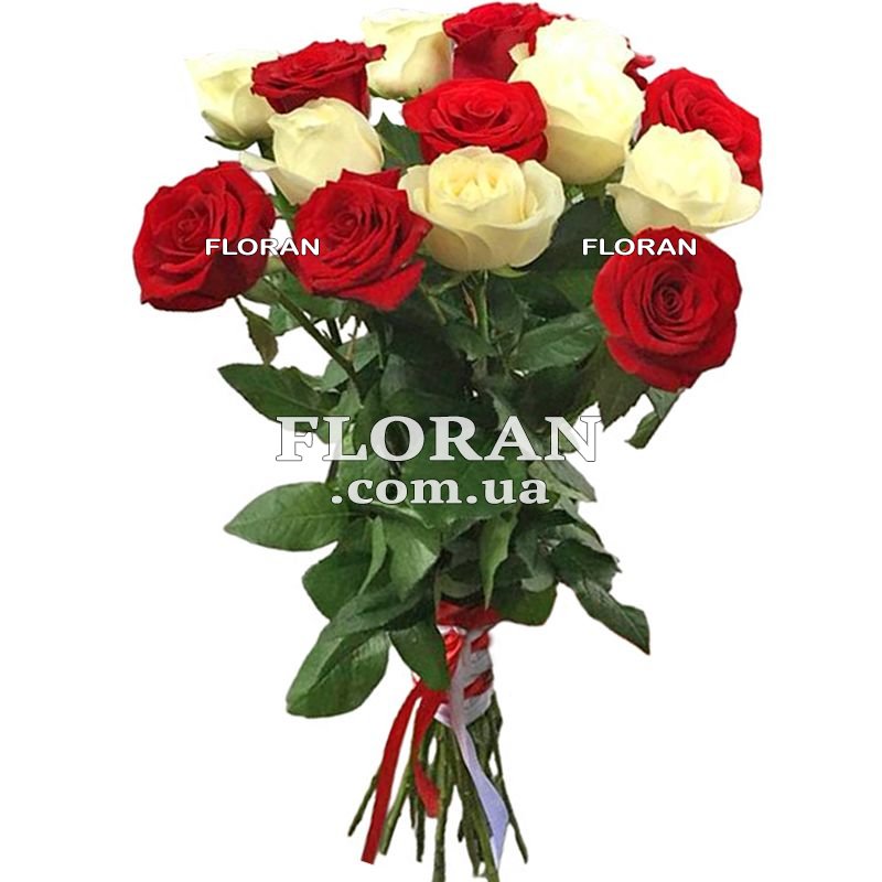 15 white-red roses - product code FL-2588. The bouquet of 15 white and red roses is an elegant and stylish combination of flowers that can express a variety of feelings and emotions. Red roses symbolize passion, love and romance, while white roses are associated with purity, innocence and respect. This bouquet can be an ideal gift for your lover or loved one. It will express your deep feelings and affection, suitable for special occasions such as Valentine's Day, anniversary or simply as an expression of your love and care. Additionally, a bouquet of white and red roses can be a great gift for other occasions. It is suitable for birthdays, wedding anniversaries, anniversaries and other special days. This bouquet can also serve as a sign of respect and gratitude to other loved ones, including friends and family. The white and red roses in this bouquet symbolize a variety of feelings and emotions, making it a universal and meaningful gift. The ribbon that the roses are wrapped with adds the finishing touch to this beautiful gift.