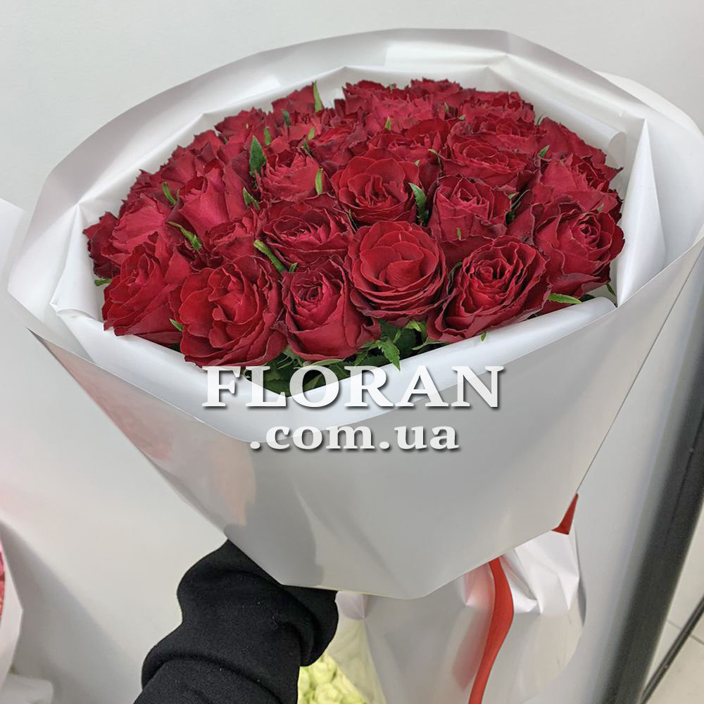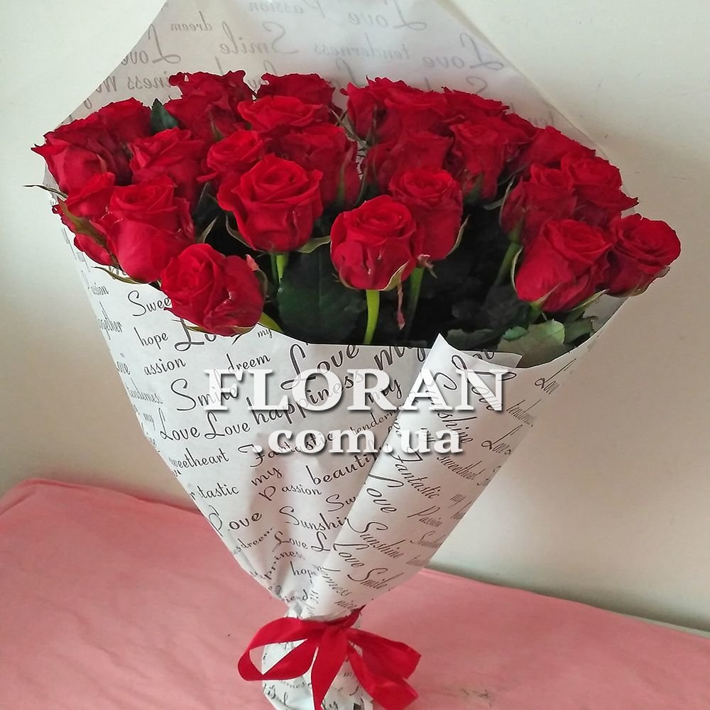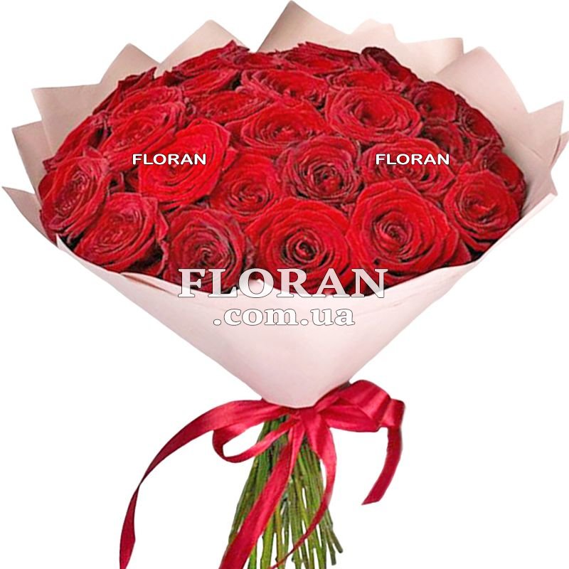 33 red roses - product code FL-61. A bouquet of roses is always the perfect gift for any occasion. But a bouquet of Ukrainian roses is not only beautiful, but also a special gift. This is the bouquet we offer you today - 33 red roses grown on Ukrainian plantations. Red roses are a symbol of passion and love, so this bouquet will be the perfect gift for your soulmate. But it is also suitable for giving to mom, sister or girlfriend. A bouquet of roses is a timeless gift that will never go out of style. Therefore, if you want to please a loved one, then 33 red roses is an excellent choice. Do not miss the opportunity to make a pleasant surprise for your loved ones and order this beautiful bouquet today.