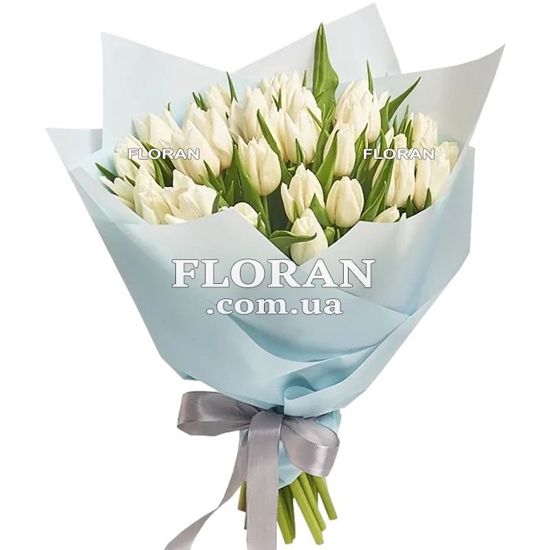 49 tulips - product code FL-2311 - this is an incredibly impressive and luxurious gift. White tulips symbolize purity, innocence and harmony. This bouquet is suitable for special occasions when you need to express sincere feelings and wish happiness. Such a magnificent bouquet of 49 tulips can be a wonderful gift for an anniversary, wedding, anniversary or other important event in life. It is also suitable for congratulating a colleague on success or wishing a speedy recovery for a loved one. Our couriers will happily deliver this bouquet to the place you specify and create a unique moment in the life of the one who receives it. This bouquet will personify your care and attention.