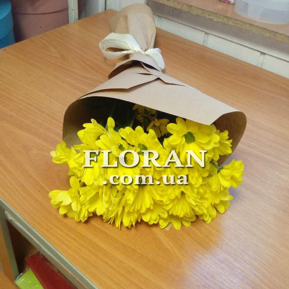 5 chrysanthemums - product code FL-325. A charming bouquet of 5 bright yellow chrysanthemums is a real sun that will warm and give a smile to a loved one. Chrysanthemums have long symbolized joy, happiness and longevity. In such a bouquet, yellow means friendship and devotion, and also gives a feeling of optimism and light.