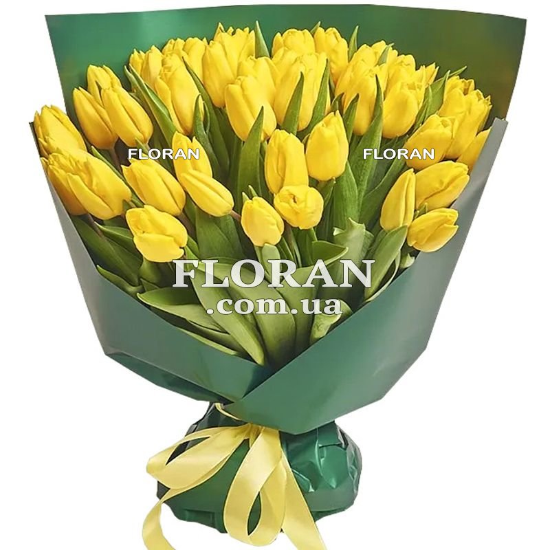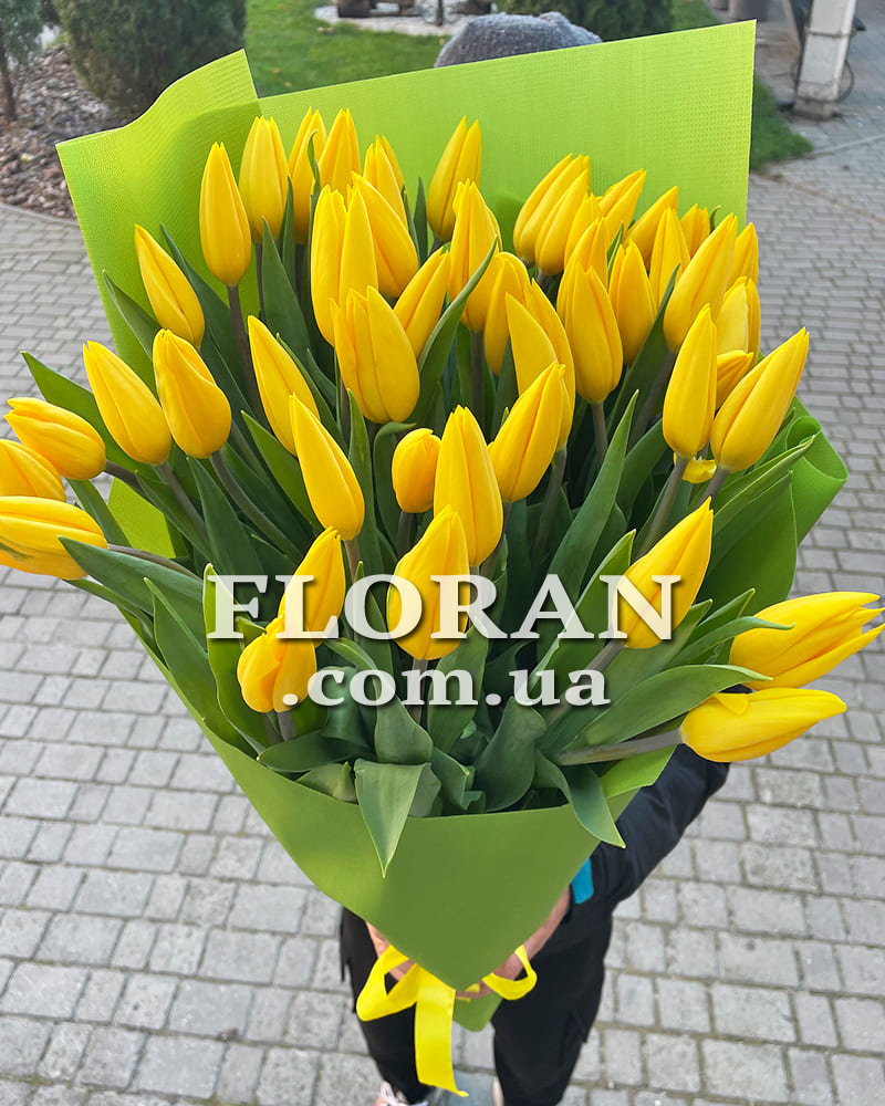 50 tulips - product code FL-2316 - a real work of art of nature. Tulips are always associated with spring and joy, and this bouquet is no exception. Yellow tulips symbolize joy, freshness and friendliness. They are great for gifts to lift your spirits and bring sunshine to drab days. A bouquet of 51 yellow tulips is not only a magnificent decoration, but also a wonderful way to express your gratitude, friendship, or wish joyful happiness. These tulips can be a gift for a birthday, anniversary, wedding or any other important event. Such an impressive bouquet will bring delight and a smile to any recipient. It doesn’t matter who it is intended for - a close friend, relative, colleague or loved one. By giving this bouquet, you are giving a piece of spring and warmth that will remain in your heart for a long time. And remember that our store is ready to provide you with a delivery service so that your gift is delivered on time and with special attention. No matter the occasion, this bouquet of yellow tulips will be a bright and joyful gift.