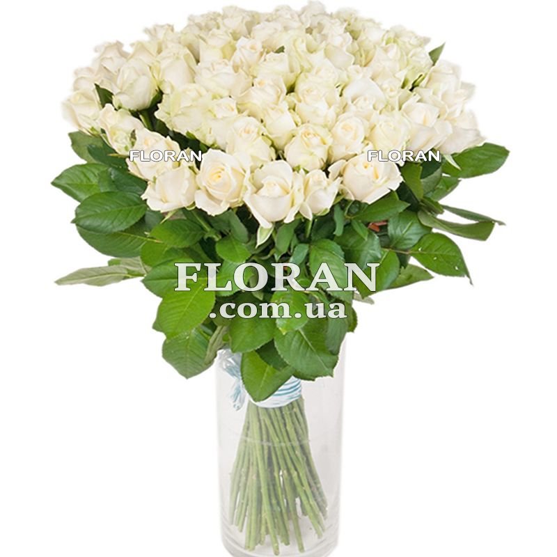 50 white roses - product code FL-77. A bouquet of roses is always the perfect gift for any occasion. But if you want to make a special gift, then 50 white roses are exactly what you need. This bouquet consists of 51 white roses adorned with a ribbon. The white color of roses symbolizes purity, innocence and sincerity of feelings. A bouquet of Ukrainian roses is a guarantee of quality and freshness of flowers.
