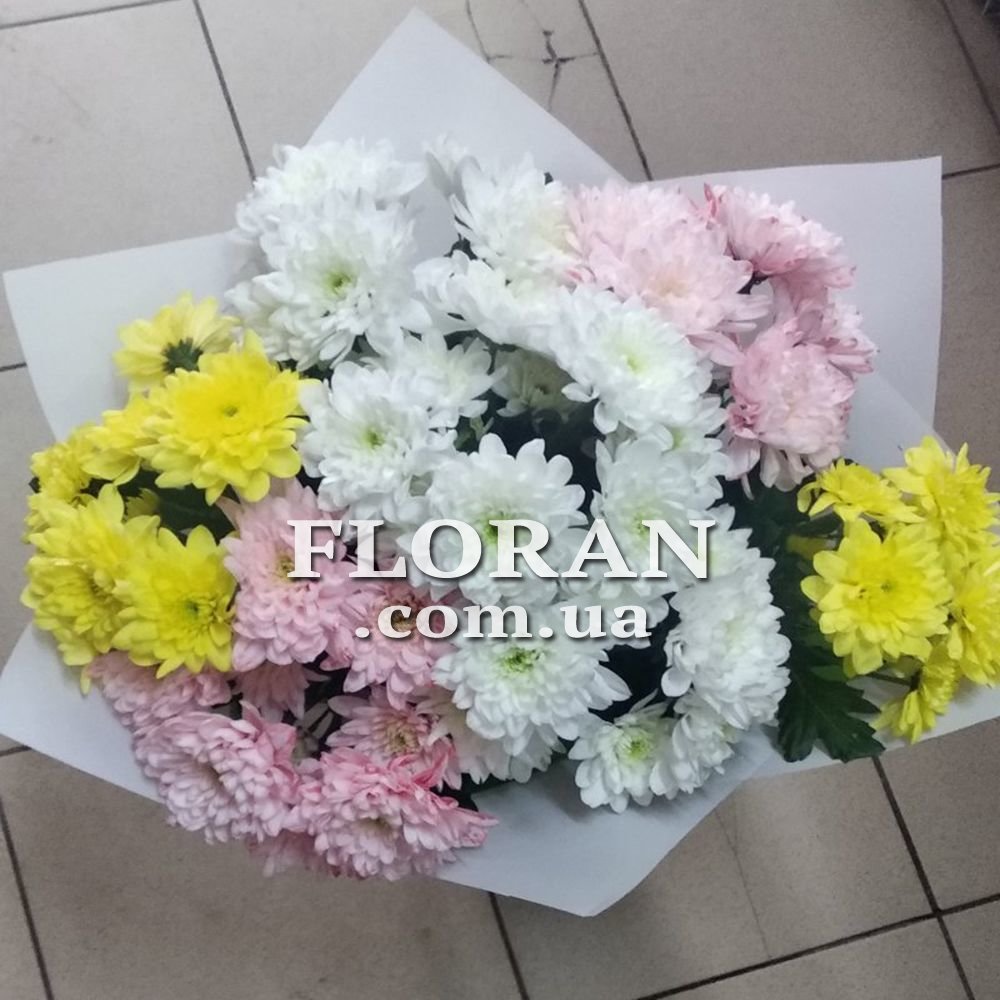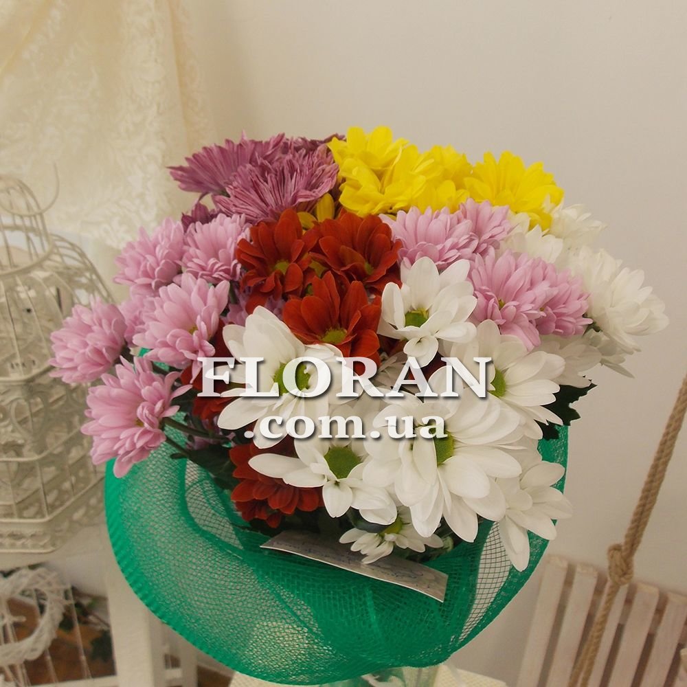 7 chrysanthemums - product code FL-327. A colorful bouquet of 7 multi-colored chrysanthemums is a great gift for any occasion, whether it's a congratulation to your uncle or grandmother. Chrysanthemums in this bouquet are presented in various shades, which gives it a special beauty and mood. In addition, such qualities as nobility, sophistication and elegance are associated with chrysanthemums. Chrysanthemums of different colors symbolize different feelings and emotions. For example, white chrysanthemums represent purity and innocence, yellow - friendship and respect, and red - passion and love. 7 chrysanthemums is the perfect choice for those who want to express their feelings and wishes. Chrysanthemums are flowers that are always in fashion and suitable for any occasion.
