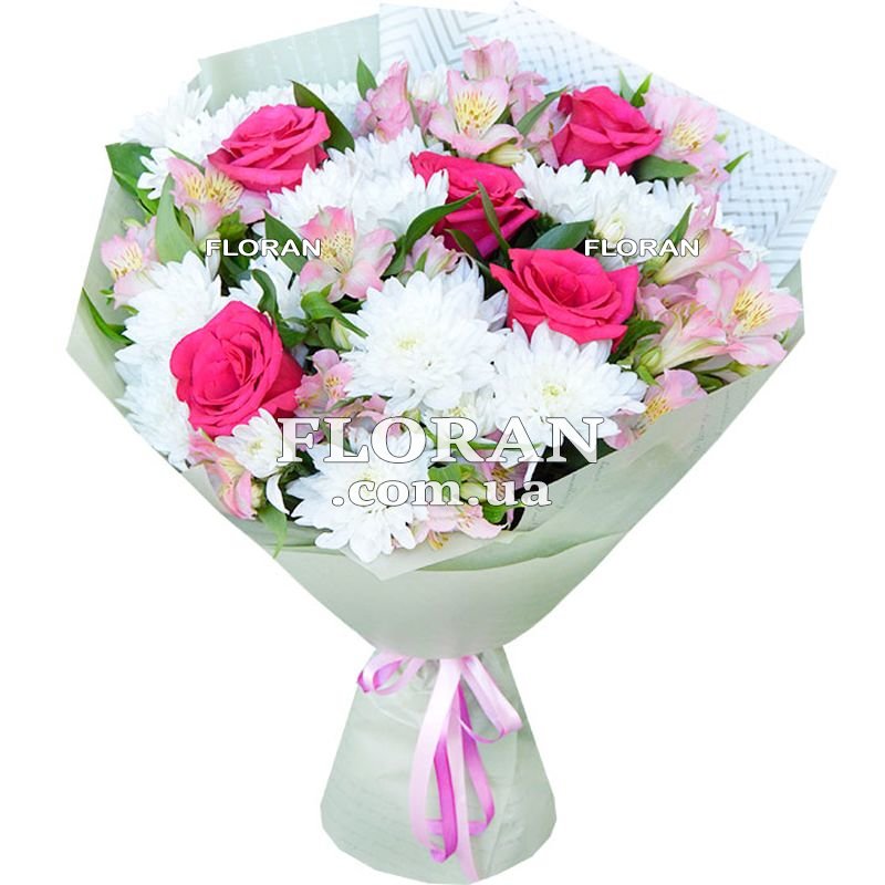 Alstroemeria chrysanthemum rose - product code FL-1102. A bouquet of alstroemeria, chrysanthemums and roses promises to be bright, elegant and attractive. This composition combines various shapes and colors of flowers, creating an interesting and stylish image. There are 5 pink roses in the bouquet, which symbolize love, beauty and elegance. Roses are classic flowers and always attract attention with their exquisite beauty and fragrance. 6 pink alstroemeria will add brightness and tenderness to the composition. Alstroemerias are distinguished by elegant flowers and soft shades, which will give the bouquet cheerfulness and romance. 6 white chrysanthemums perfectly complement the composition with their delicate and voluminous flowers. Chrysanthemums symbolize sincerity, purity and longevity. The white color of the chrysanthemum gives freshness and purity to the bouquet.