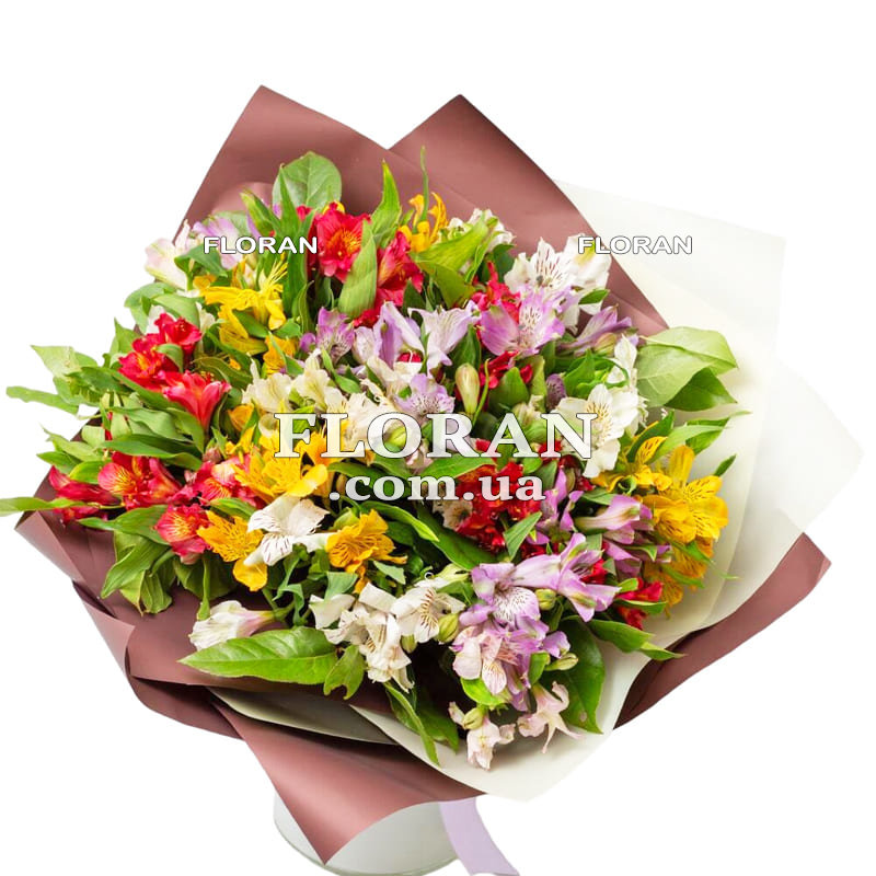 Alstroemeria for your beloved - product code FL-825. A bouquet of 21 multi-colored alstroemerias is an excellent choice for a gift to your beloved woman. These vibrant flowers symbolize enduring love, devotion and affection. A bouquet of alstroemerias looks great in the living room or bedroom, creating a warm and cozy atmosphere.