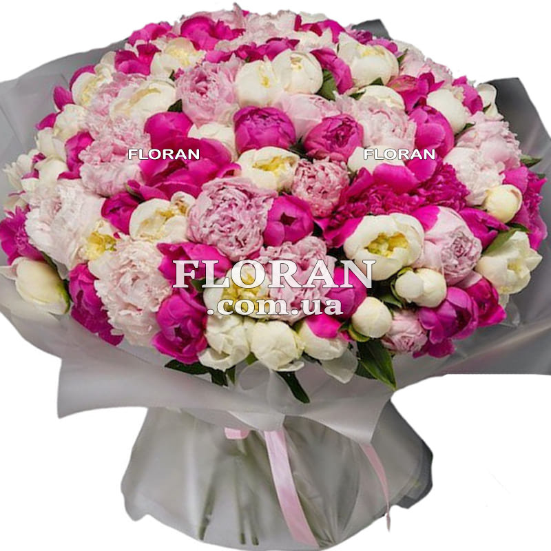 A huge bouquet of peonies - product code FL-948. Imagine the delight and amazement that a girl will experience when she sees in front of her a huge bouquet of 151 multi-colored local peonies. This is an impressive number of flowers, each of which is imbued with bright hues and a unique aroma.