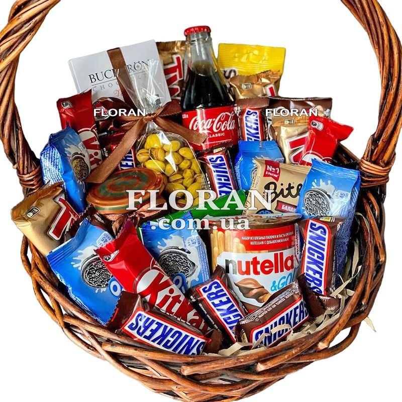 Basket of goodies - product code FL-481 - an ideal gift for lovers of sweets and snacks! It is filled with all the necessary goodies to satisfy any taste. The composition includes 5 packages of cookies that are suitable for tea drinking, 14 chocolate bars that will make any day sweeter, 3 bars of chocolate that can be shared with loved ones, Coca-Cola to quench your thirst, M&M's to try something new, cashews to add texture and honey to add notes of sweetness and wholesomeness. This basket is suitable both for home use and as a gift to colleagues at work or friends for a picnic.
