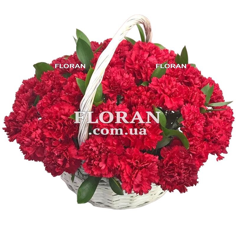 Basket of red carnations - product code FL-1690 - is a great choice for creating a spectacular and elegant gift. In this composition you will find 41 red carnations, which are a symbol of passion, strength and love. Red carnations combined with greens create a contrasting and vibrant look. Greenery gives the bouquet freshness and naturalness, making it even more attractive. The composition in the basket adds originality and makes it easy to move and arrange the bouquet as desired. Such a bouquet of 41 red carnations in a basket will be a great gift for any special occasion - Birthday, Anniversary, Valentine's Day or just to please and surprise your loved one or loved one. It will express your passion, love and affection, leaving an unforgettable impression. We guarantee that the bouquet will be neatly decorated and delivered on time. Our delivery service will ensure that your gift arrives fresh and keeps its beauty for a long time. Choose this lovely basket of 41 red carnations to delight and delight your recipient. Whether it is your beloved, mother, sister or colleague, this bouquet will become an expressive symbol of your love and care.