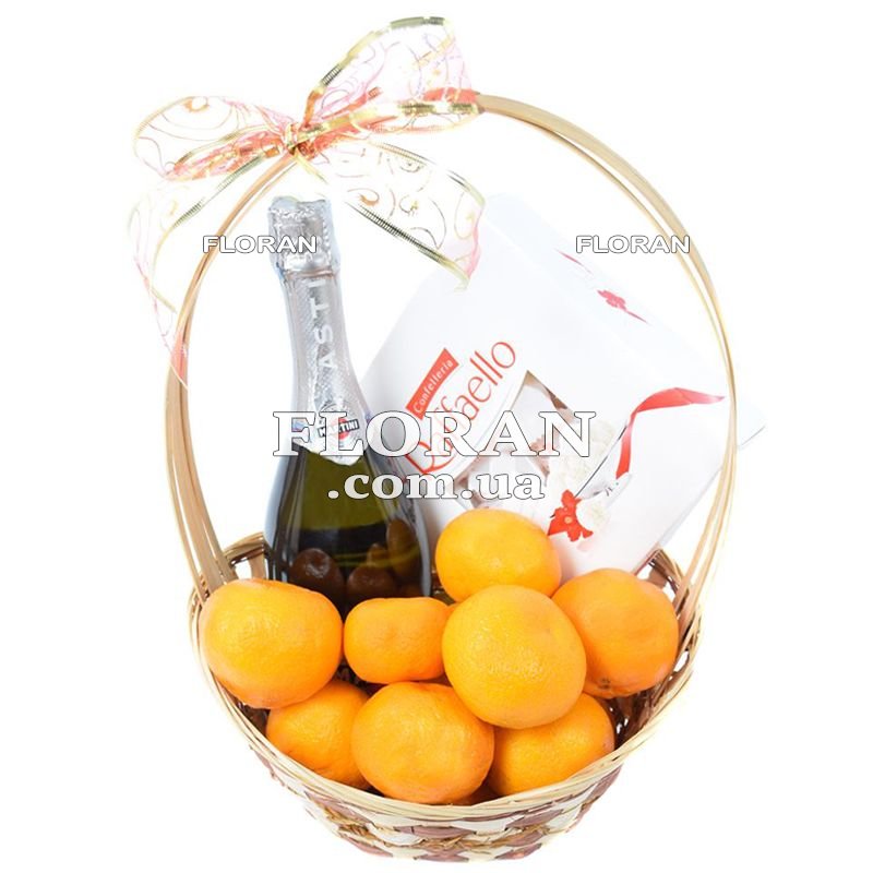 Basket with champagne - product code FL-610. An ideal gift for the New Year is a gift basket with champagne, tangerines or oranges 1.5 kg, Martini Asti champagne 0.75 l, Raffaello sweets 210 g. This is a great gift for mom or loved one, especially if you are abroad and cannot personally congratulate them. In addition, your godfather will also be happy to receive such a delicious and beautiful gift. Filled with fresh and juicy tangerines, exquisite Martini Asti champagne and light, delicate Raffaello sweets, this basket will delight everyone who receives it. A basket of sweets and citrus fruits is a great way to wish your loved ones and friends a Happy New Year. Give them this basket and they will be happy to receive such a tasty and beautiful gift.