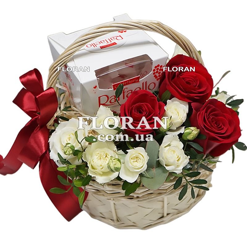 Basket with flowers and Raffaello - product code FL-2057 - is a real embodiment of tenderness and sophistication. It combines gorgeous flowers and delicious Raffaello to make your day special and unforgettable. Raffaello sweets are delicate balls covered with coconut flakes with amaretto-almond flavor. They taste good and create an atmosphere of comfort and joy. The flowers in this basket are three red roses and four white or cream spray roses. Red roses symbolize passion and love, while white or cream roses add sophistication and tenderness to the bouquet. This basket is perfect for romantic moments like wedding day, relationship anniversary or just to make an ordinary day special. It can be given as a gift to a woman, so and a man, because flowers and sweets are always relevant and friendly. The delivery of this basket is an opportunity to surprise even if you are far away. Our courier will deliver it to the specified location and create an unforgettable experience for the recipient. It is easy to order such a gift - you can do it on our website or contact us via instant messengers. Surprise your loved ones with the taste and beauty of this beautiful basket.