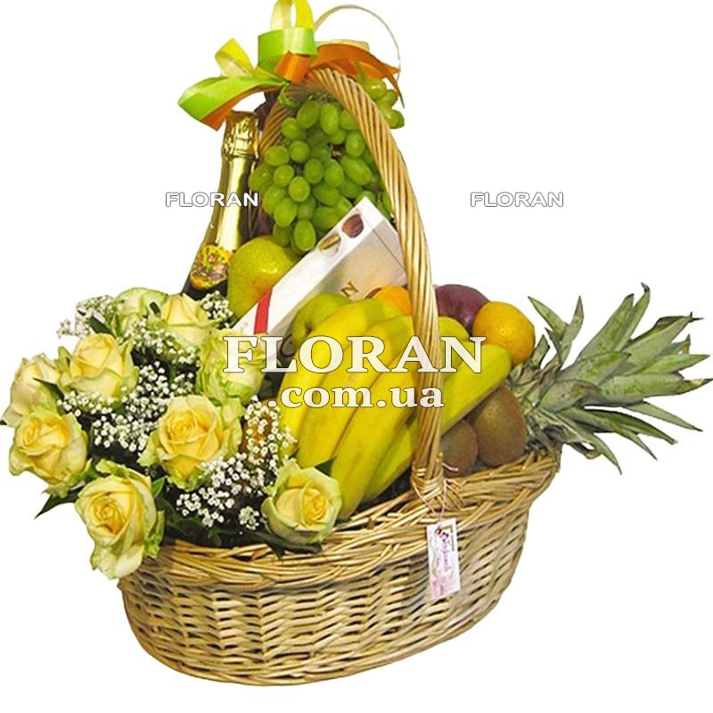 pineapple, oranges, apples, kiwi, bananas, pears, grapes 1 bunch, Fragolino sparkling wine 0.75 l, sweets 125 g, 9 yellow roses, gypsophila or greens