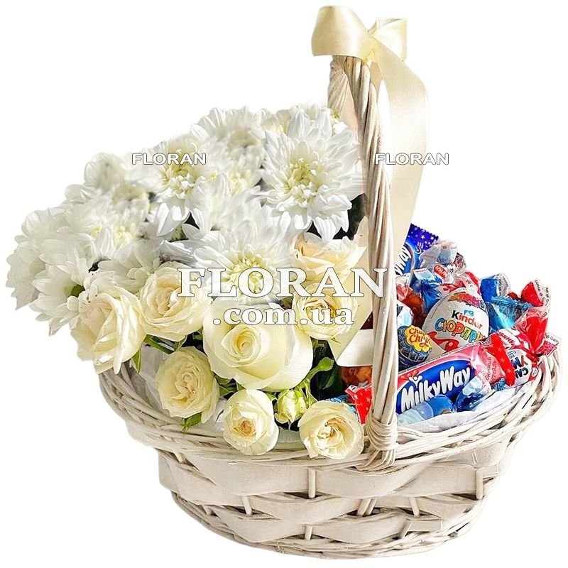 Basket of sweets and flowers - product code FL-2052 - is a wonderful gift that combines the tenderness of flowers and the sweet taste of treats. This gift fills with joy and warmth, and it is suitable for different occasions and holidays. Kinder Surprise are cheerful and bright eggs with surprises inside that always delight children and adults. They add playfulness and joy to your day. Chocolate bars and Chupa Chups are sweet treats that perfectly complement the taste of Kinder Surprise and make the perfect sweet combination. A variety of loose sweets is a real pleasure for the sweet tooth. You can enjoy different flavors and share them with your loved ones. White roses and chrysanthemums are delicate and beautiful flowers that symbolize purity, tenderness and respect. They add a share of romance and beauty to the gift. Such a gift is ideal for congratulations on an anniversary, birthday, Valentine's Day or any other holiday. It will express your care and attention to the recipient, giving him vivid emotions and sweet moments. Order this basket of sweets and flowers from us and we will be happy to deliver it to the recipient, creating a special and unforgettable moment of joy.