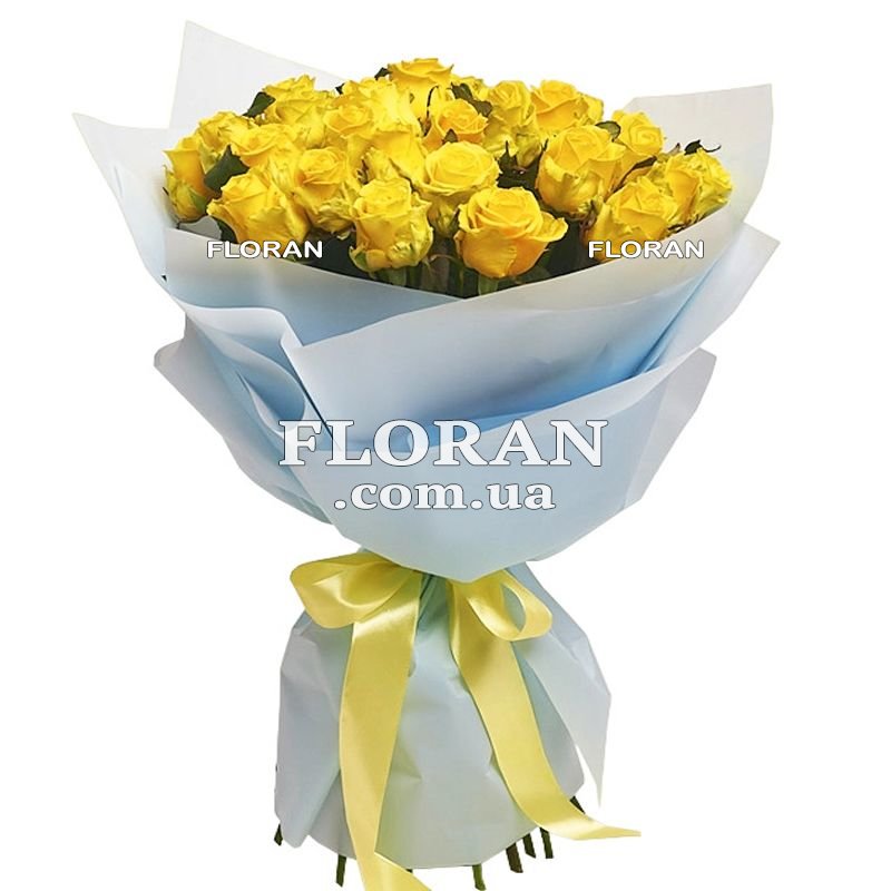 Beautiful bouquet of yellow roses - product code FL-2614 - is a magnificent gift that radiates a bright sunny mood and joy. Yellow roses symbolize friendship, joy and happiness, and such a bouquet can bring goodwill and support to your loved one. This bouquet will be an ideal gift for friends and loved ones whom you want to please and improve their mood. Yellow roses are also suitable for congratulations on particularly special events, for example, at the end of some important life chapter. Additionally, yellow roses can be a symbol of gratitude and appreciation. Therefore, such a bouquet is also suitable for expressing gratitude to people who support and help you. In addition, we guarantee the quality and freshness of each rose in the bouquet, as well as professional delivery at a time and place convenient for you. Your gift will be a pleasant surprise for your loved one.