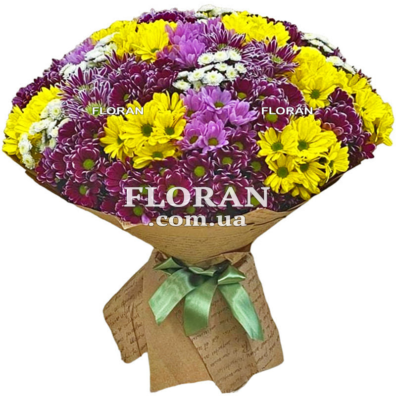 Beautiful bouquets of chrysanthemums - product code FL-878. This beautiful bouquet of 35 colorful chrysanthemums makes a bright and impressive gift for any occasion. Chrysanthemums are one of the most popular and beautiful flowers and this bouquet represents their variety and beauty. In the bouquet you will find multi-colored chrysanthemums of various shades. They can be bright reds, delicate pinks, rich purples or fresh yellows. Each chrysanthemum has its own unique shape and texture, creating a wonderful combination of different colors.