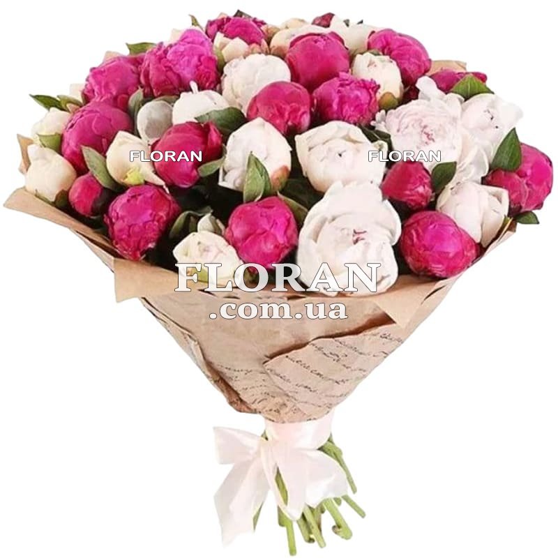 A large bouquet of peonies - product code FL-959. A large bouquet of fifty-five white and pink peonies is an unforgettable explosion of beauty and grace. The combination of these two colors creates an impressive contrast and gives the bouquet a special appeal. White peonies in this bouquet symbolize purity, tenderness and perfection. Their snow-white petals, as if slightly touched by the magical light, give the bouquet nobility and elegance. White peonies also express feelings and deep affection.