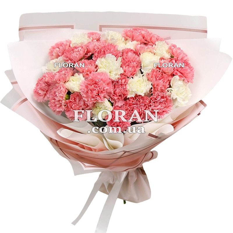 Birthday carnations - product code FL-438. Carnations are a wonderful choice for birthday gifts. These flowers symbolize joy, love and dawn. White carnations can express purity and innocence, pink - tenderness and romance. A bouquet of dianthus can be either laconic or large and chic. It can become a bright accent in the interior and a joyful gift for a birthday person. Carnations will always embody warm feelings and give joy! They express good wishes and perfectly highlight a special birthday. Regardless of the age and preference of the birthday person, a bouquet of carnations will be a great gift that offers a smile of joy on this special day.