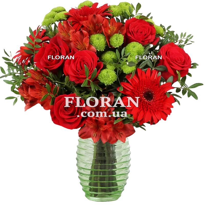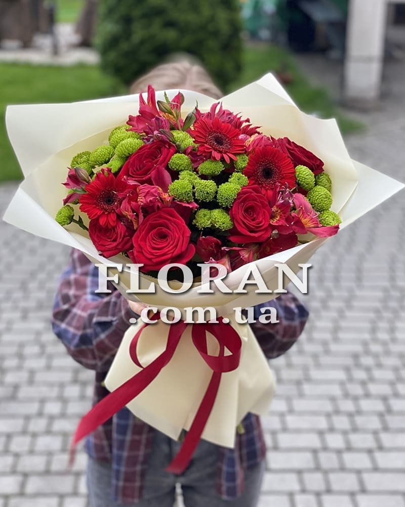 Bouquet for a man happy birthday - product code FL-1127. A bouquet consisting of 3 red gerberas, 5 red roses, 4 red alstroemerias and 3 green chrysanthemums is perfect for congratulating a man on his birthday. This bouquet is stylish and elegant, bringing joy and festive mood. Red gerberas are a symbol of energy, passion and strength. They add brightness and expressiveness to the bouquet, emphasizing the importance of this special day. Gerberas are also a symbol of joy and joy, making them the perfect choice for birthday greetings. Red roses are a classic symbol of love and affection. They add a romantic and emotional accent to a bouquet. Red roses are also a symbol of beauty and magnificence, making them the perfect gift for a special man on this special day. Red alstroemerias are a symbol of passion and desire. They add texture and dimension to the bouquet, creating an interesting contrast with the gerberas and roses. Alstroemerias also symbolize lasting and lasting love, which makes them a significant element in a birthday bouquet. Green chrysanthemums are a symbol of fidelity and longevity. They give the bouquet freshness and natural aesthetics. The green color of chrysanthemums symbolizes reliability and calmness, which makes them suitable for a man's bouquet. This bouquet for a happy birthday man is impressive and represents your love, care and congratulations. It highlights the importance of this special day and is a great way to express your goodwill.