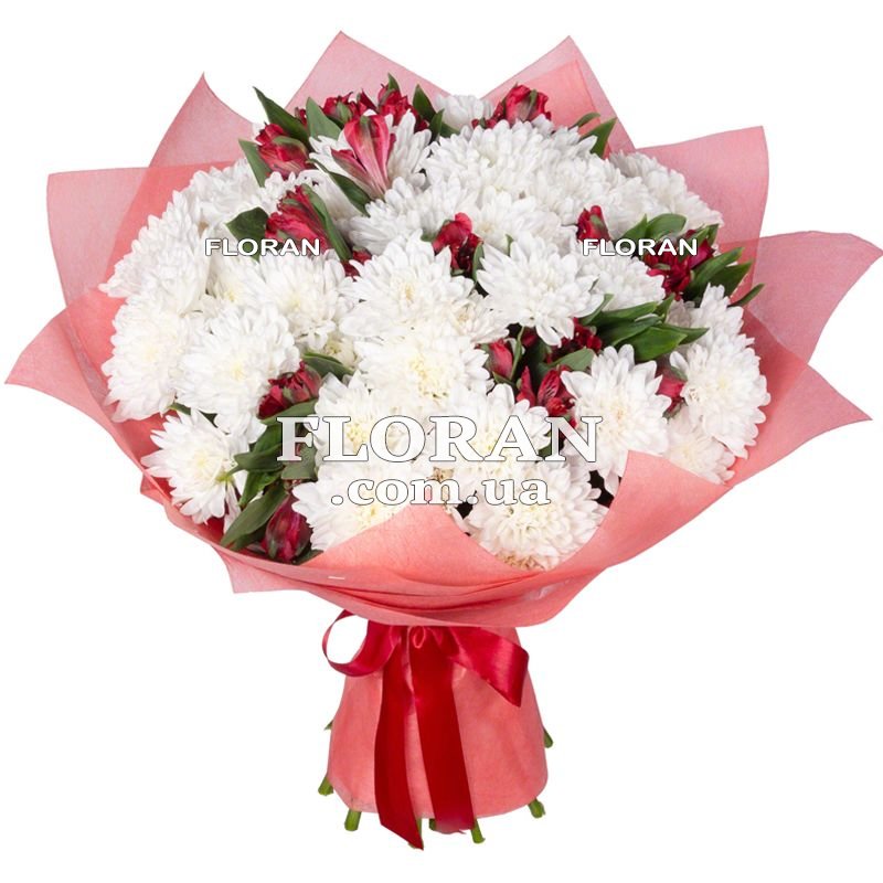 Bouquet for mom - product code FL-1203. A bouquet with a composition of 10 white chrysanthemums and 7 red alstroemerias is the perfect way to express your love and gratitude to your mother for her endless care and support. This bouquet will symbolize your affection for her and show how important she is in your life.