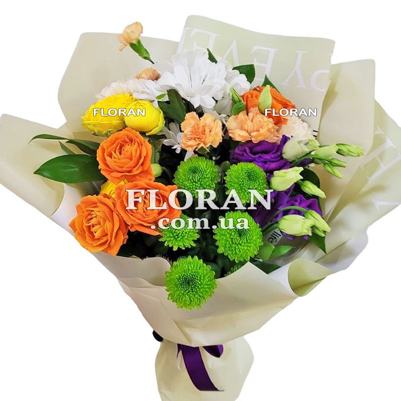 Bouquet mix - product code FL-1281. This bouquet is a bright and varied combination of flowers. It includes 2 yellow spray roses, 1 orange spray rose, 3 white and green chrysanthemums, 5 carnations, 2 purple eustomas, as well as packaging that will highlight its beautiful appearance. Yellow spray roses symbolize joy, happiness and friendship. They give the bouquet brightness and energy. The orange spray rose adds warmth and fervor, conveying your best wishes and passionate emotions. White and green chrysanthemums bring freshness and purity to the bouquet. They symbolize loyalty, reliability and tenderness. Carnations bring a sense of sophistication and elegance. Purple eustomas add grace and mystery. Wrapping your bouquet will give it a finished look and help keep the flowers fresh and protected during shipping or handling. This mix bouquet will be the perfect gift for any occasion, from birthdays to anniversaries. It expresses your admiration and gratitude, and will also add joy and color to the life of the recipient.