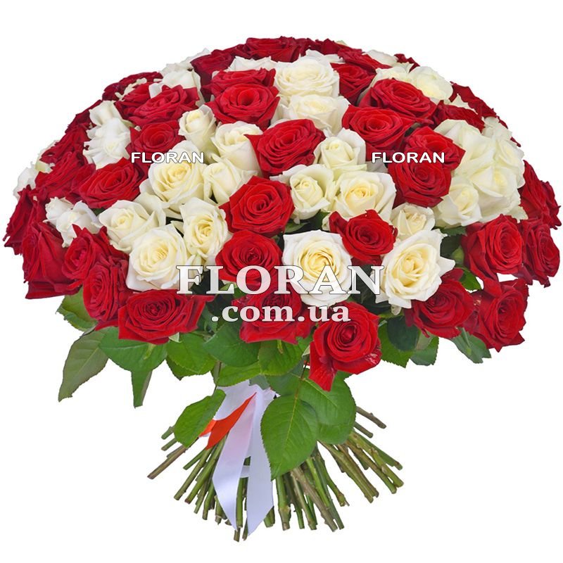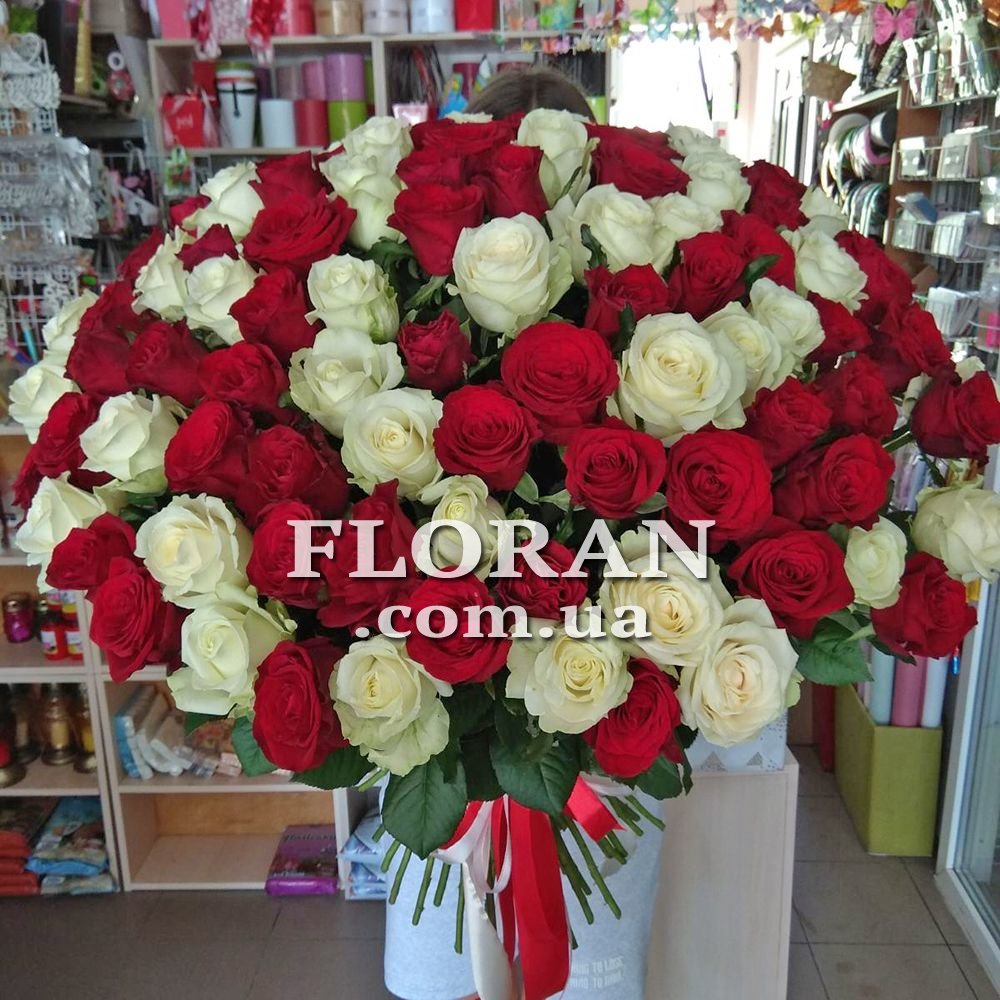 Bouquet of 101 red and white roses - product code FL-142. No gift can please a woman like a bouquet of 101 short roses in a bright mix of red and white flowers, 40 cm high!