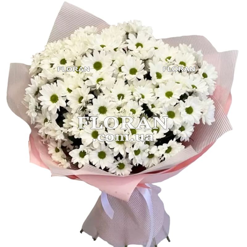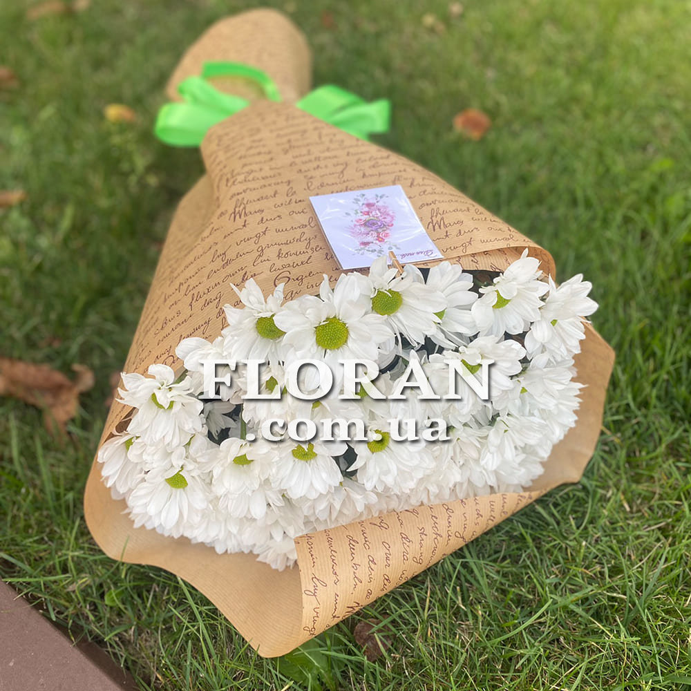 Bouquet of 11 daisies - product code FL-909. A bouquet of 11 daisies is a delicate and elegant combination, represented by 11 white daisy chrysanthemums. Each chamomile in this bouquet is a symbol of purity and freshness. The white color of daisies gives the bouquet sophistication and perfection. It symbolizes innocence, tenderness and purity of feelings. White daisies are a wonderful choice for expressing respect, recognition, or simply to bring joy and freshness.