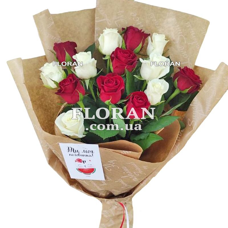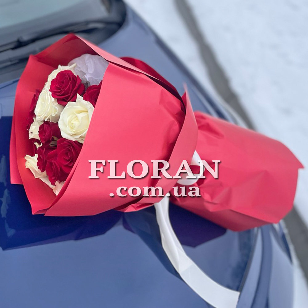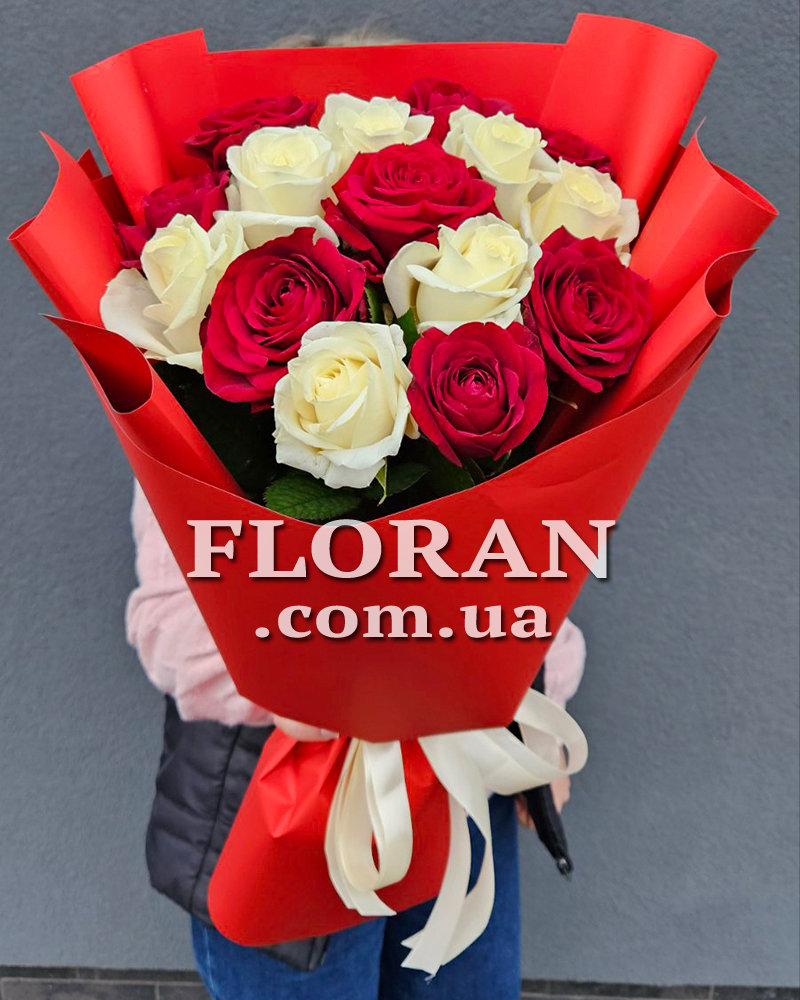 Bouquet of 15 red and white roses - product code FL-2587 - is an amazing combination of colors that can express many feelings and emotions. Red roses are usually associated with passion, love and romance, while white roses symbolize innocence, purity and respect. This bouquet is ideal for various occasions. For example, you can gift it to your lover or loved one as a sign of your deep affection and passion. This bouquet is perfect for Valentine's Day, an anniversary or just to express your love. Additionally, a bouquet of red and white roses can be a great gift for other important moments in life, such as a birthday, wedding anniversary or other special dates. It can also be used to express respect and gratitude, making it a versatile gift option for family, friends or colleagues. Regardless of the occasion, a bouquet of 15 red and white roses is a symbol of your care, tenderness and deep feelings. Packaged with care and attention, it will help create a special and unforgettable moment for the recipient.