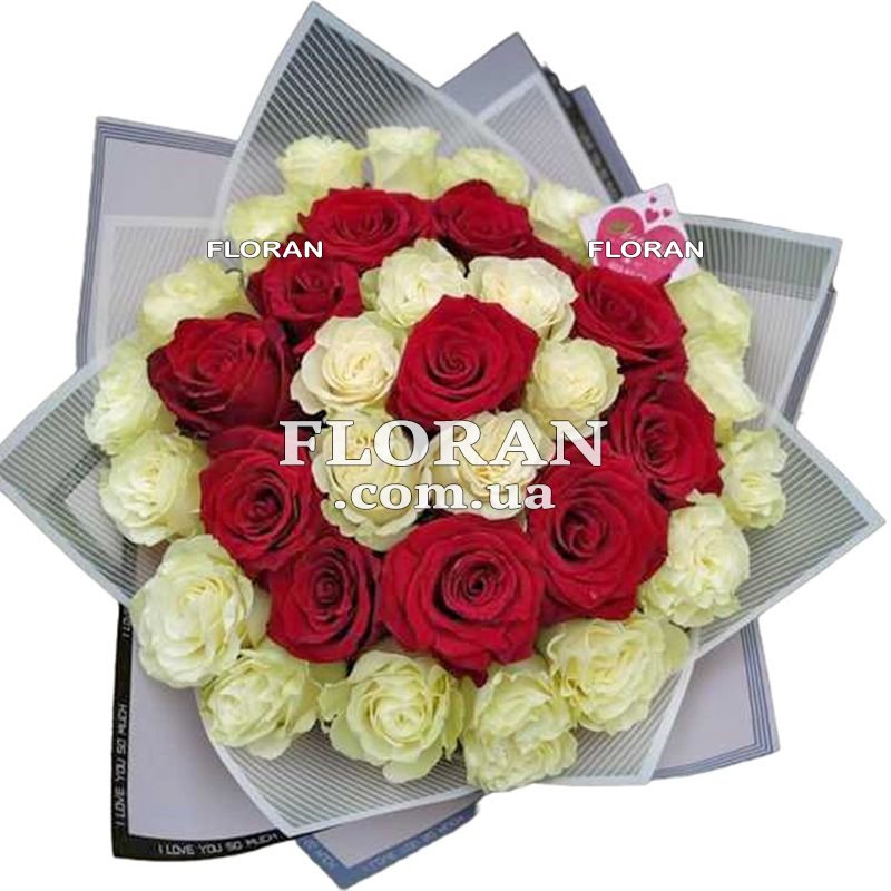 Bouquet of 35 roses - product code FL-1708 - is a combination of passion and tenderness, which speaks of deep feelings and sincere affection. Red roses are a symbol of passion, love and romance, while white roses represent purity, innocence and fidelity. This magnificent bouquet reflects the harmony and beauty of relationships, whether it is a gift from heart to heart, a gift for a lover, wife, or girlfriend. When you present a bouquet of 35 red and white imported roses, you are saying words that are so often difficult to express. This bouquet speaks of love, devotion and gratitude, that you appreciate and cherish this special person in your life. It is able to awaken a storm of emotions and cause enthusiastic smiles, becoming a wonderful symbol of your deep affection. We make sure that your gift is special and unique, so our team of florists creates each bouquet with love and creativity. By selecting the freshest and most beautiful roses, we are sure that your bouquet will delight you with its beauty and aroma for a long time. And to make your experience even more pleasant, we offer a convenient service of delivering flowers to any city in Ukraine. Thus, you can please your loved ones, being anywhere in the country, and give joy and smiles at a distance. Leave your feelings to words and give beauty - a bouquet of 35 imported roses, which will forever be remembered and remain in the heart of the one to whom it is addressed.