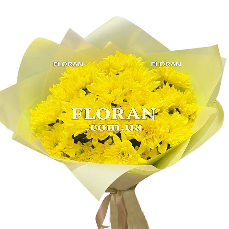 Bouquet of 5 spray chrysanthemums - product code FL-892. Bouquet of 5 yellow chrysanthemums is a small but bright and energetic bouquet that attracts attention with its brightness and positive mood. The main characters in this bouquet are 5 yellow bush chrysanthemums. Yellow chrysanthemums symbolize joy, happiness and optimism. It gives brightness and energy to the bouquet, lifts your spirits and creates a festive atmosphere. Bouquet of 5 yellow chrysanthemums is ideal for a gift to friends, relatives or colleagues. It symbolizes the joyful moments, friendship and prosperity. Such a bouquet can be given as a gift for a special holiday or just to cheer up and brighten up the day.
