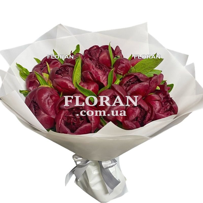 Bouquet of burgundy peonies - product code FL-3030 - is an expressive and stylish gift that is perfect for creating a solemn and sophisticated atmosphere. Burgundy peonies symbolize luxury, status and deep feelings, making this bouquet an ideal choice for special occasions and meaningful moments. Each peony in this bouquet is distinguished by large and rich buds that open, filling the space with its rich and refined aroma. The burgundy color gives the bouquet special sophistication and chic, emphasizing its luxurious and elegant appearance. The packaging is chosen with care for each flower to preserve their freshness and attractiveness. This bouquet will be a wonderful gift for any occasion - from anniversaries to romantic meetings and holidays. Burgundy peonies always evoke admiration and respect, bringing an atmosphere of luxury and sophistication to the home. By giving a bouquet of 17 burgundy peonies, you not only give flowers, but also express your deep feelings and admiration. Let these exquisite flowers brighten your loved one's day, filling their life with joy, warmth and admiration.