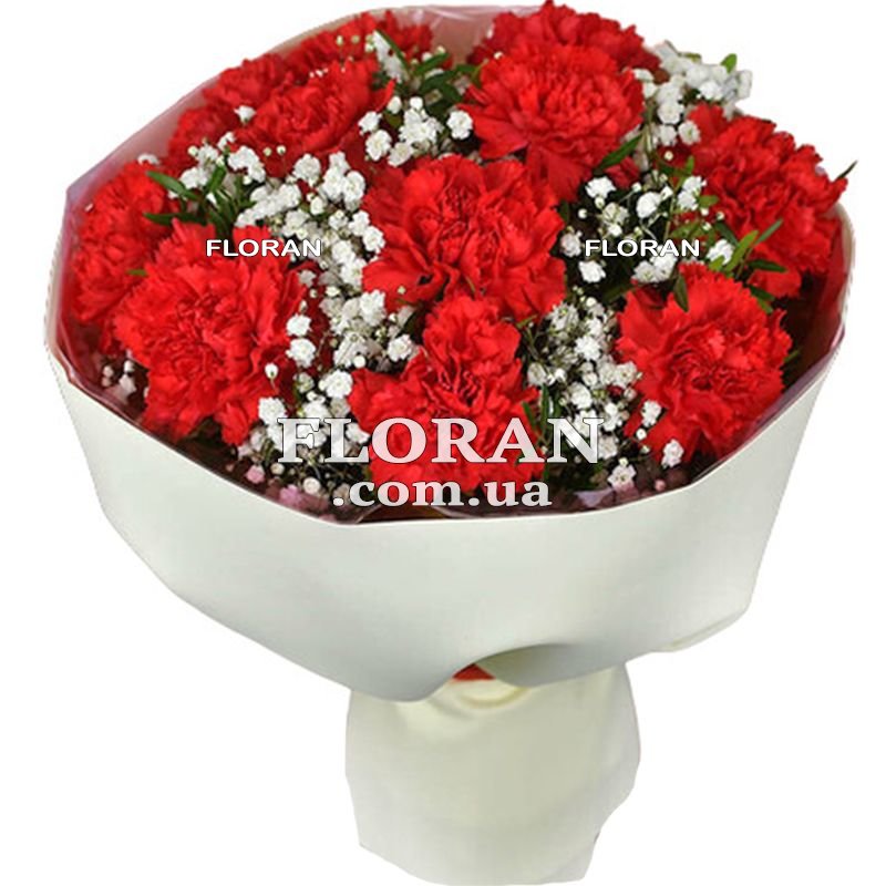 Bouquet of carnations for a girl - product code FL-1689 is a romantic and stylish gift choice for a girl. Red carnations symbolize passion and love, and gypsophila adds lightness and tenderness to the composition. Each red carnation in this bouquet expresses strong emotions and affection. They fill the air with the aroma of passion and create an atmosphere of romance. Gypsophila, with delicate white flowers, complements the composition with its light and airy texture, giving it a special elegance. The package, in which they are neatly arranged, gives the bouquet a complete and elegant look. It not only protects the flowers during delivery, but also gives them mystery and mystery. This bouquet of 11 red carnations with gypsophila will be the perfect gift for special occasions - Birthday, Anniversary, Valentine's Day or just to express your love and affection. He will show your admiration and care for the girl. We guarantee that the bouquet will be delivered on time and will keep the freshness and beauty of each carnation. Our delivery service will ensure that your gift is special and puts a smile on the girl's face. Choose this exquisite bouquet of 11 red carnations with gypsophila to express your feelings and create an unforgettable atmosphere of romance. It will become a symbol of your love and affection, leaving an unforgettable impression on your girlfriend.