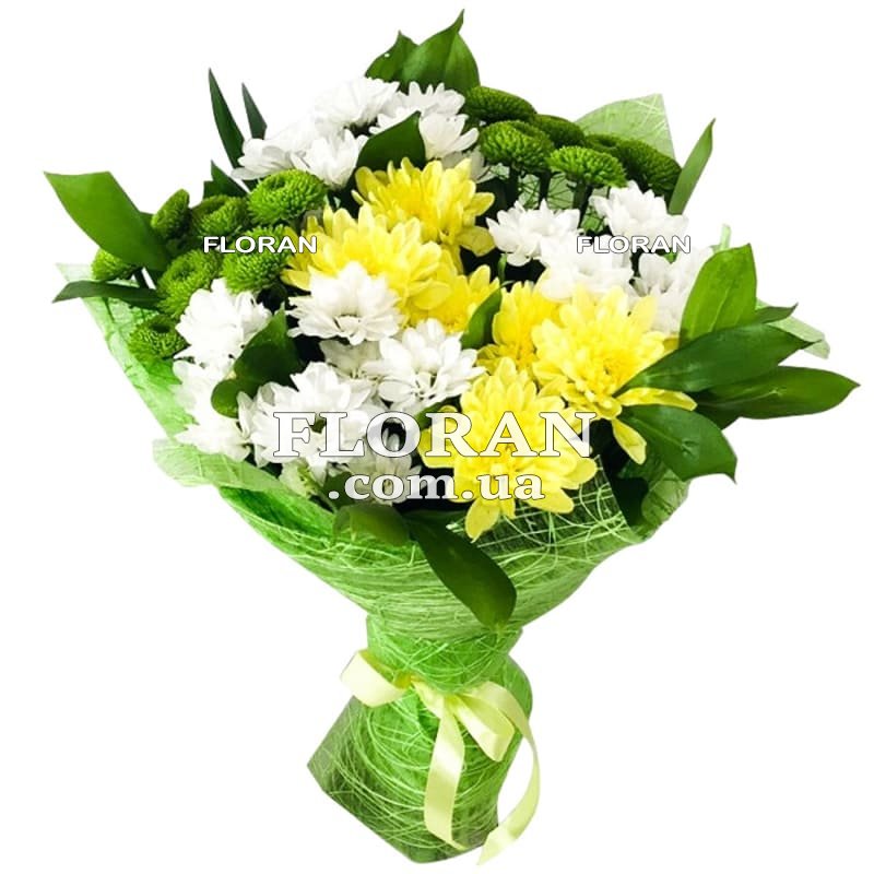 Bouquet of chrysanthemums and greenery - product code FL-859. A bouquet of 7 multi-colored chrysanthemums with the addition of greenery will create a wonderful composition that combines the beauty of flowers and the freshness of greenery. In such a bouquet, colored chrysanthemums will be the main accent, and greenery will serve as a great background and addition.