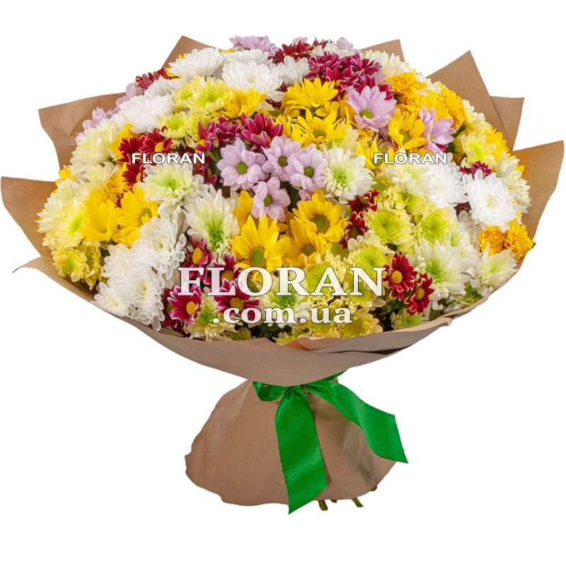 A bouquet of 61 colorful chrysanthemums is great for various occasions and holidays. It can be a wonderful gift for a birthday, anniversary, wedding or just to cheer up and please loved ones. Multi-colored chrysanthemums symbolize joy, love, friendship and cheerfulness.