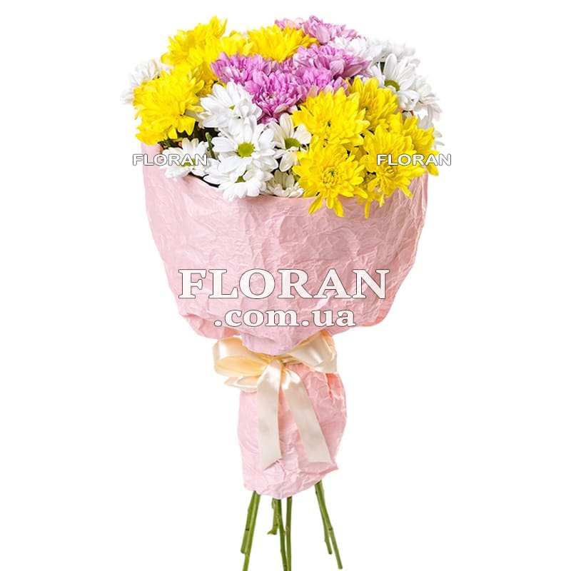 Bouquet of colored chrysanthemums - product code FL-847. A bouquet of 9 multi-colored chrysanthemums will create a bright and joyful mood. Chrysanthemums are beautiful flowers that can please the eye with a variety of their shades. In this bouquet, each chrysanthemum will bring its own unique color accent, which will create a bright and lively combination.