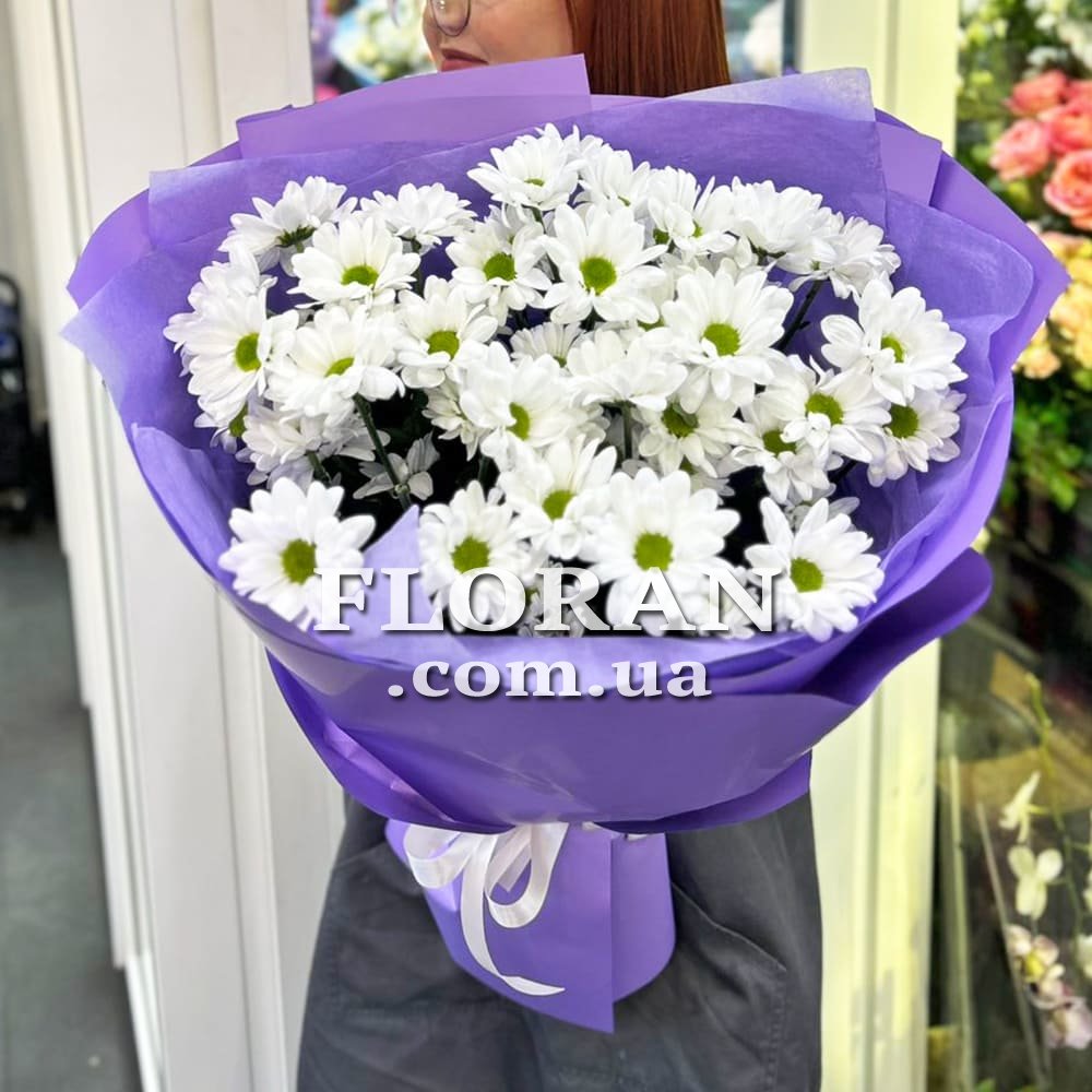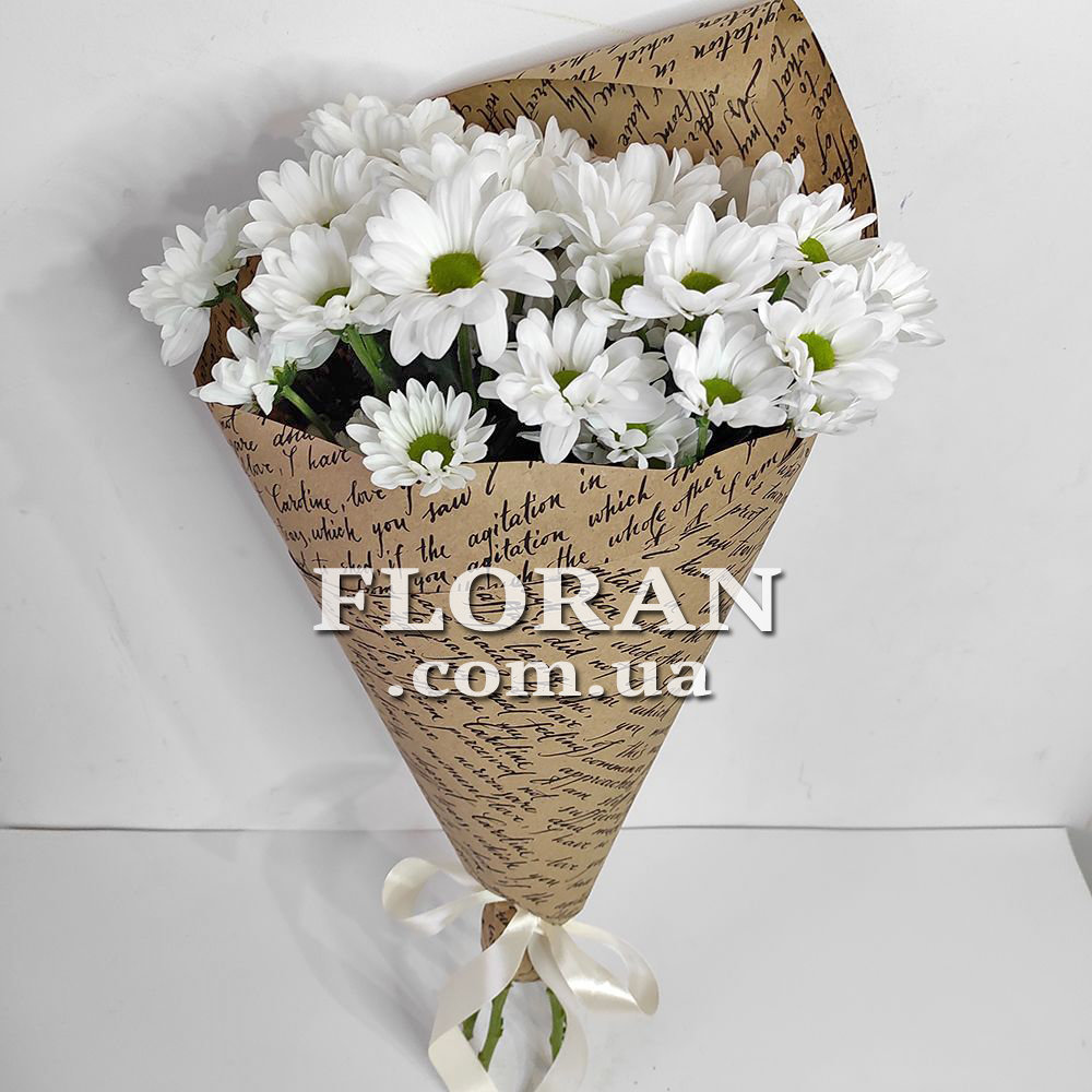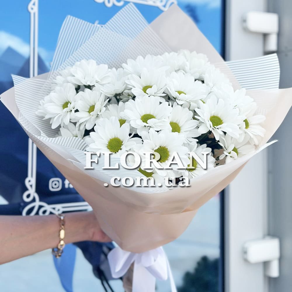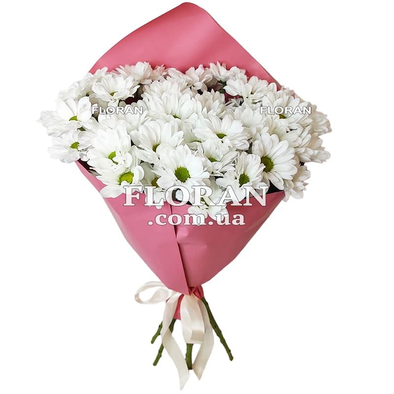 Bouquet of daisies - product code FL-865. A bouquet of 5 white chamomile chrysanthemums will be a sweet and gentle gift. The white color of daisies symbolizes purity, innocence and freshness. Each daisy in this bouquet will look dainty with its ruffled petals and vibrant center disc.