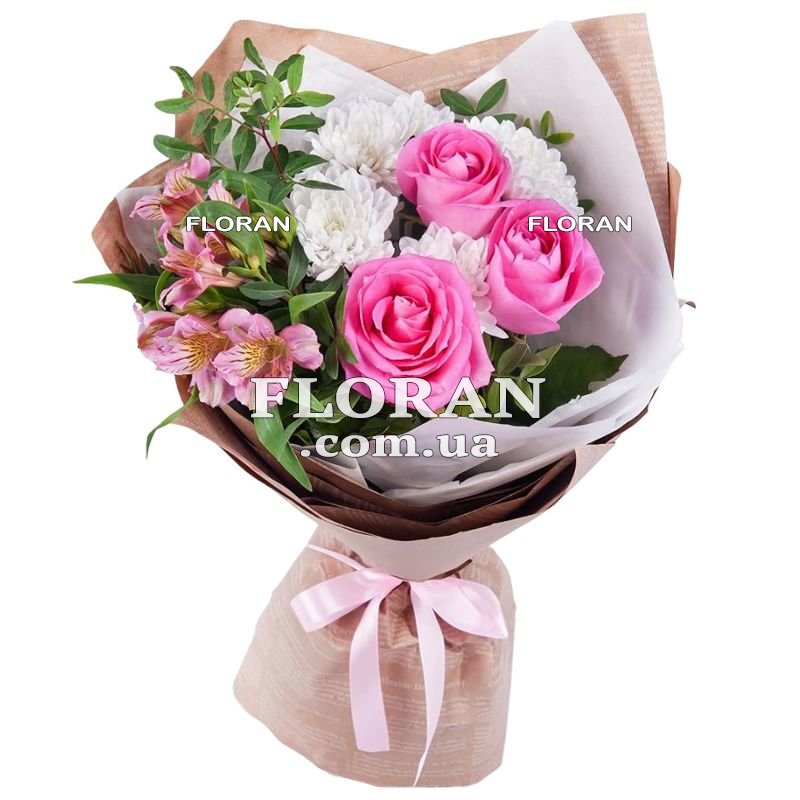 - 3 pink roses. Roses symbolize tenderness and beauty. Pink color adds romance and delicacy to the bouquet.