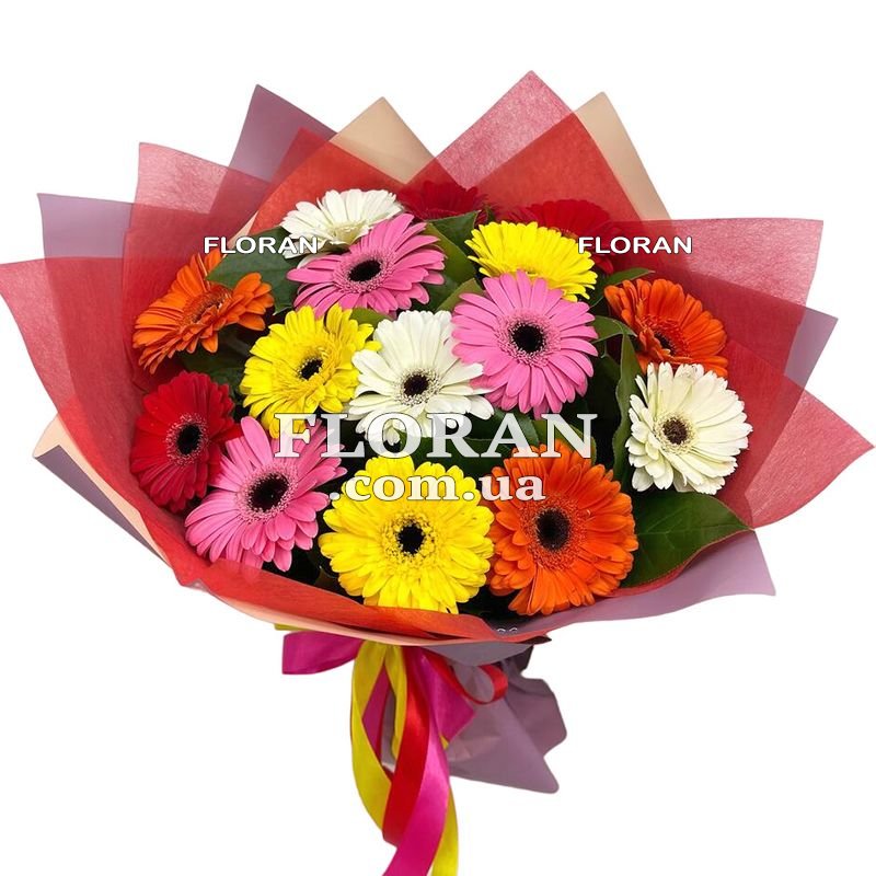 Bouquet of gerberas- product code FL-1549 - a great gift choice for your brother or boyfriend in honor of Cossack Day or Angel Day. Gerberas are bright and joyful flowers that perfectly convey energy and strength. As a symbol of the Cossack spirit and courage, gerberas will give your brother or boyfriend a sense of masculinity and strength. The various colors of gerberas combined in this bouquet will symbolize the versatility and versatility of his personality. This bouquet of gerberas will not only add brightness and beauty to a special day, but will also become a sign of your love, respect and pride for your brother. He will appreciate this magnificent gift and feel your presence and support, even if you cannot be there on this special day. Don't forget to add a personal message or card to convey your warmest words and wishes to your brother. This bouquet of gerberas will be a reminder of your strong connection and the special connection between you. Give your brother this wonderful gerbera bouquet and he will feel your love, support and blessing in every flower. This will be a special and meaningful gift that will remind you of your family affection and mutual support throughout your life.