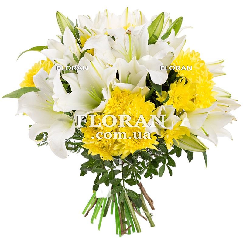 A bouquet of lilies and chrysanthemums - product code FL-1135. A bouquet of 4 white lilies and 7 yellow chrysanthemums is a wonderful combination of grace and brightness that will bring joy and freshness to any moment. White lilies symbolize purity, innocence and sophistication, while yellow chrysanthemums bring joy, optimism and a sunny mood. White lilies with their majestic and graceful flowers are a symbol of luxury and elegance. They attract attention with their exquisite beauty and give the bouquet a sophisticated look. The white color of lilies is also associated with purity and tenderness, making this bouquet suitable for various special occasions. Yellow chrysanthemums, in turn, add brightness and sunny mood to the bouquet. They symbolize joy, friendship and prosperity. The yellow color of chrysanthemums is also associated with energy and optimism, which makes this bouquet suitable for raising the mood and presenting positive emotions.