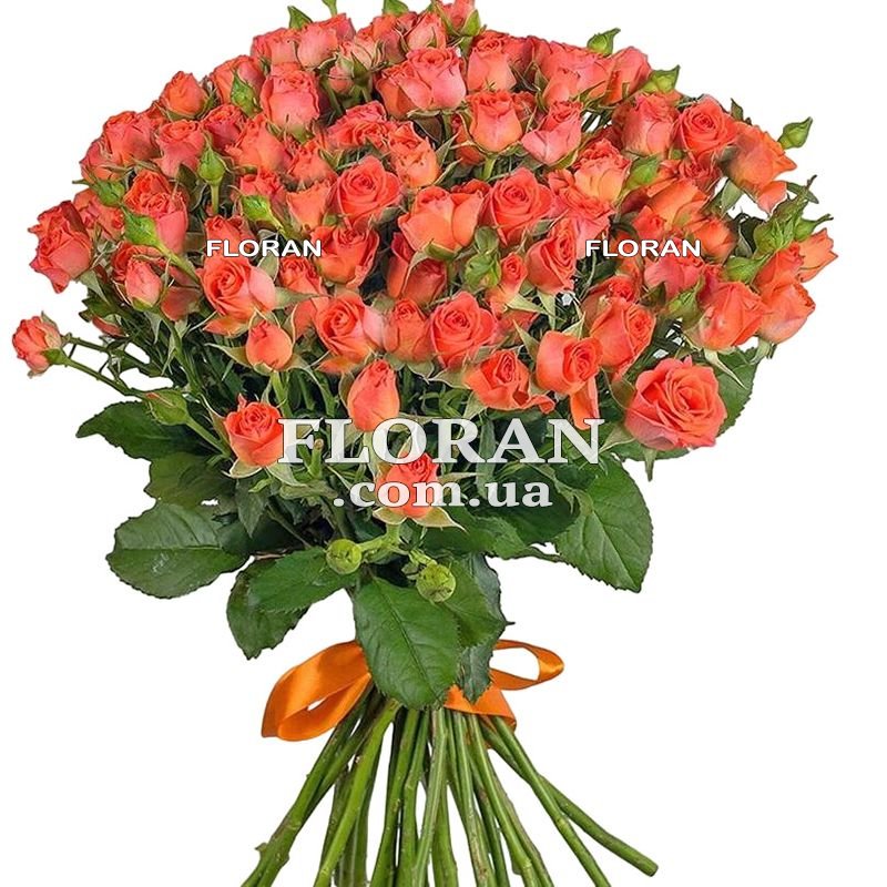 Bouquet of orange spray roses - product code FL-1420 - is a bright and energetic manifestation of your feelings and attention to the recipient. Each rose in this bouquet is the personification of warmth, passion and joy. Orange color symbolizes enthusiasm, happiness and sunny mood. It fills others with positive energy and attracts attention. A bouquet of orange spray roses will be a great gift for someone who appreciates bright emotions and unusual color schemes. You can choose ribbon or wrapping for this bouquet to enhance its beauty and complete it. Our team of professionals will ensure that the bouquet is carefully packaged and delivered safely. Delivery of this bouquet of orange spray roses is available to please your recipient in any city. The attentive courier of our store will ensure that the bouquet is delivered with care and on time. This bouquet of orange spray roses will be a wonderful display of your emotions and will create a warm and bright atmosphere in the life of the recipient. It is suitable for various holidays or just as a sign of attention and support.