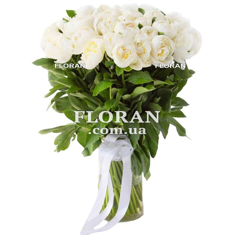 Bouquet of flowers peonies - product code FL-960. A bouquet of 37 white peonies is a real beauty that will bring sophistication and grace to any space. White peonies, with their purity and tenderness, delight and impress with their simplicity and elegance. Each peony in this bouquet has an amazing shape and thick petals that create magnificent volume and luxury. The white color of peonies symbolizes purity, innocence and perfection. It evokes a feeling of harmony and tranquility, creating an atmosphere of peace.