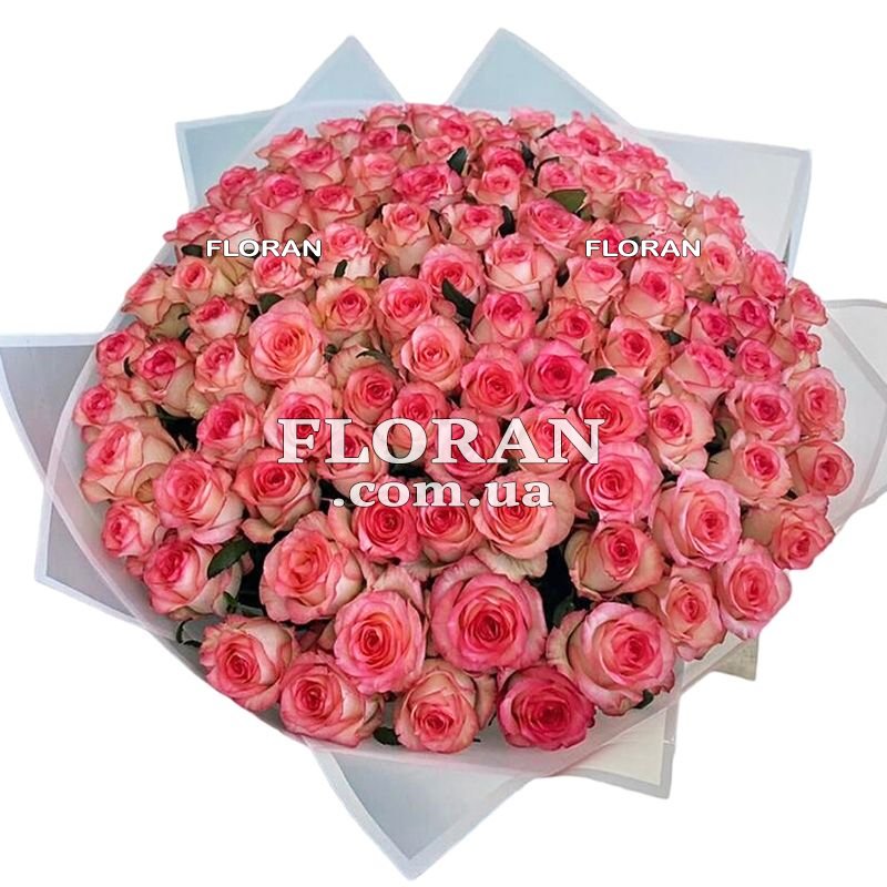 Bouquet of pink roses for birthday - product code FL-2724 - is the perfect gift for a birthday celebration. Pink roses are a symbol of tenderness, emotion and love, and they give a special warmth and joy. This bouquet will perfectly emphasize your attention and care for the person to whom it is addressed. Pink roses represent the deep feelings and warmth of your wishes. They create an atmosphere of joy and celebration, making them an ideal birthday gift. Each Jumilia rose in this bouquet is incredibly beautiful and fragrant, their delicate petals will delight the eye and nose, and their beautiful color will add a pop of color to your special day. In our flower shop, we carefully compose each bouquet so that it is perfect and creates an unforgettable holiday atmosphere. We also offer convenient delivery so that your gift arrives on time and makes this birthday special and unforgettable for the recipient. Give bright emotions and joy with a bouquet of 95 pink roses!