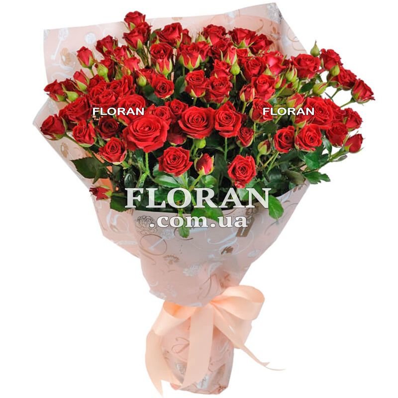 Bouquet of red spray roses - product code FL-111. This bouquet of spray roses is a real find for those who are looking for a bright and beautiful gift. It contains 23 red spray roses that create a unique effect. Spray roses are distinguished by great splendor and rich color, which makes the bouquet even more expressive and impressive. Red spray roses are a symbol of passion and love, so this bouquet of branch roses will be a great gift for your loved one. Red roses look very impressive and attractive, so this bouquet will definitely not go unnoticed. It is filled with passion and love, each flower radiates energy and warmth, and small spray roses add sophistication and airiness. To receive such a bouquet is a real joy that will warm your heart and remind you of your love for many years to come.