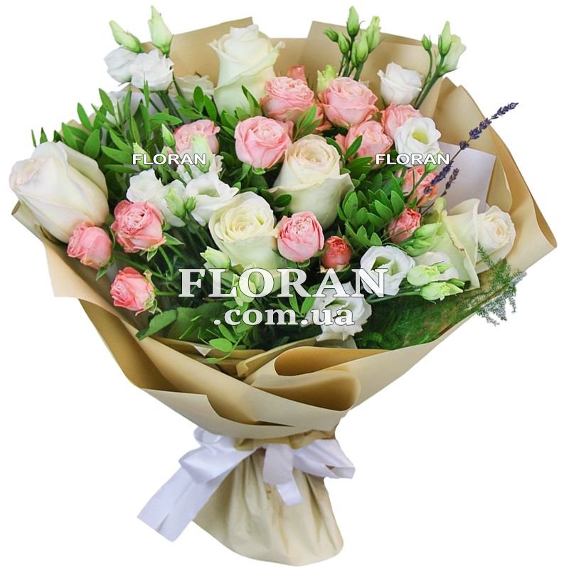 Bouquet of roses and eustoma - product code FL-1138. A bouquet of 5 white roses, 5 spray roses and 5 white eustomas creates a perfect combination of elegance and sophistication. White roses are a symbol of purity, tenderness and endless love. They add grace and romance to the bouquet. Shrub roses, with their juicy petals and strong stems, add volume and texture to the bouquet. They perfectly complement white roses and create contrast. White eustomas, with their delicate flowers and many buds, add lightness and grace to the bouquet. They add airiness and create interesting accents among roses. Eustomas can also serve as an additional decoration for a bouquet and give it freshness and longevity.
