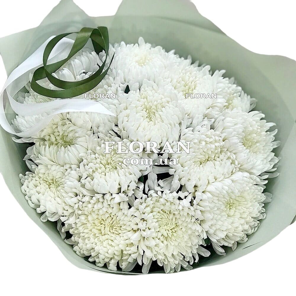 This bouquet of 17 white single-headed chrysanthemums makes a wonderful gift for a wedding, anniversary, birthday or other special occasion. Each chrysanthemum in this bouquet is distinguished by its unique beauty and perfection. They are wonderfully combined with each other, creating a harmonious and attractive color combination. The white color of the chrysanthemum will emphasize their shape and texture, giving them a special charm.