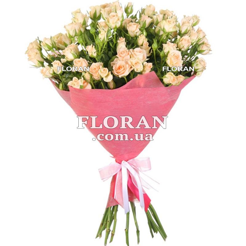 Bouquet of small roses - product code FL-107. This bouquet of spray roses is the perfect gift for any occasion. It contains 17 creamy spray roses that create a delicate and romantic look. A bouquet of spray roses is always an up-to-date and beautiful gift. Each rose in this bouquet has its own unique look and fragrance. A bouquet of branch roses is an unusual and beautiful option for those who like to experiment. Cream-colored roses in this bouquet create a special atmosphere and emphasize tenderness and romance. This bouquet of 17 creamy spray roses will be a wonderful gift for your beloved woman or girl. It is suitable for any occasion - from birthday to wedding. Present this bouquet and you definitely will not go unnoticed.