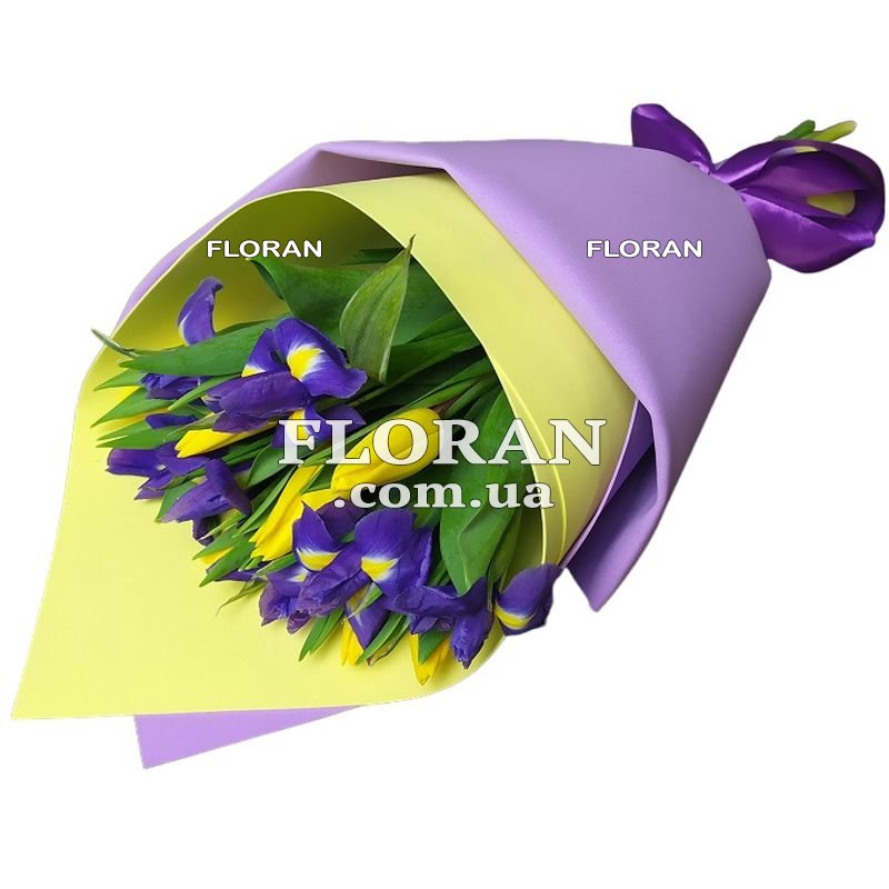 Bouquet of tulips and irises - product code FL-2485 - is a bright and sophisticated combination of flowers that bring freshness and joy. Yellow tulips and irises have their own unique symbolism and beauty. Yellow tulips symbolize sun, joy and optimism. These flowers bring bright colors and light into the life of the recipient. By giving yellow tulips, you express your joy and goodwill. Irises, in turn, symbolize tenderness and devotion. They create an atmosphere of tenderness and harmony. The combination of irises and yellow tulips gives the bouquet balance and brightness. Packaging for a bouquet helps maintain its freshness and give the gift a complete look. This adds extra elegance and will make your gift look the best. A bouquet of 7 yellow tulips and 8 irises is suitable for a variety of occasions and recipients. It can be a sign of attention and joy, as well as a wonderful manifestation of tender feelings and devotion. Our store guarantees reliable delivery of bouquets to any city in Ukraine and to any place. We make sure that your gift reaches the recipient in the best condition, preserving the freshness and beauty of the flowers. A bouquet of 7 yellow tulips and 8 irises is a manifestation of joy and bright emotions. This bouquet brings bright moments of happiness and makes the recipient's day special and unforgettable.