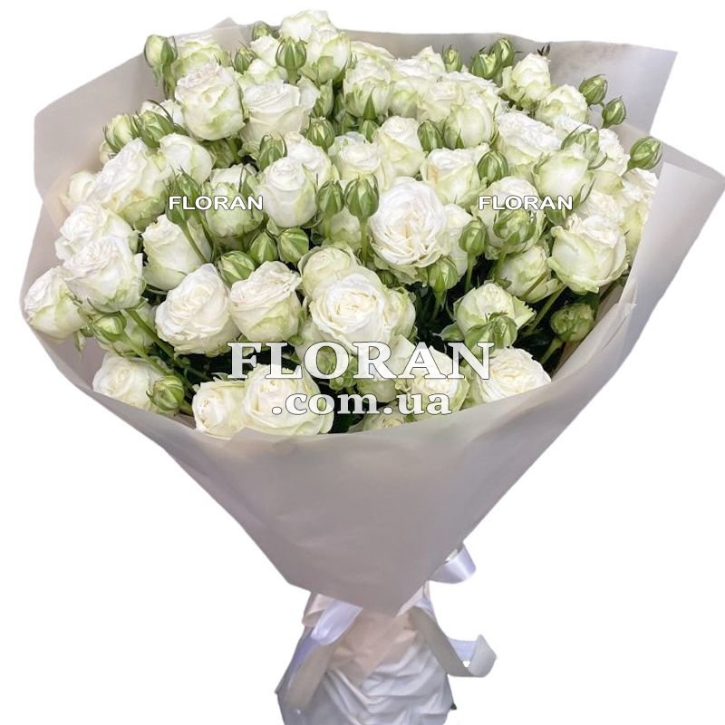 Bouquet of white spray roses - product code FL-1408 - is a great choice for a special occasion or for expressing pure and tender feelings. White roses are a symbol of purity, innocence and sincerity, and this bouquet will accurately convey all these qualities. Each white spray rose in this bouquet sparkles with its delicate beauty, reflecting purity and grace. This bouquet will create an atmosphere of sophistication and romance, allowing your feelings to be expressed brightly and beautifully. Packed with care and attention, this bouquet will be a wonderful gift for a special person. It will give joy and admiration, and its aroma will fill the air with sensuality and freshness. It doesn't matter who you want to please - it can be your beloved woman, mother or even a good friend. White spray roses will be the perfect sign of attention and recognition and will show how much you appreciate this person in your life. We are ready to arrange delivery of this delightful bouquet of white spray roses to any city. Our team will try to make the delivery process as convenient and fast as possible so that you can please your loved one, even if you are away. Choose this bouquet of white spray roses and bring joy and beauty to those who deserve the finest.