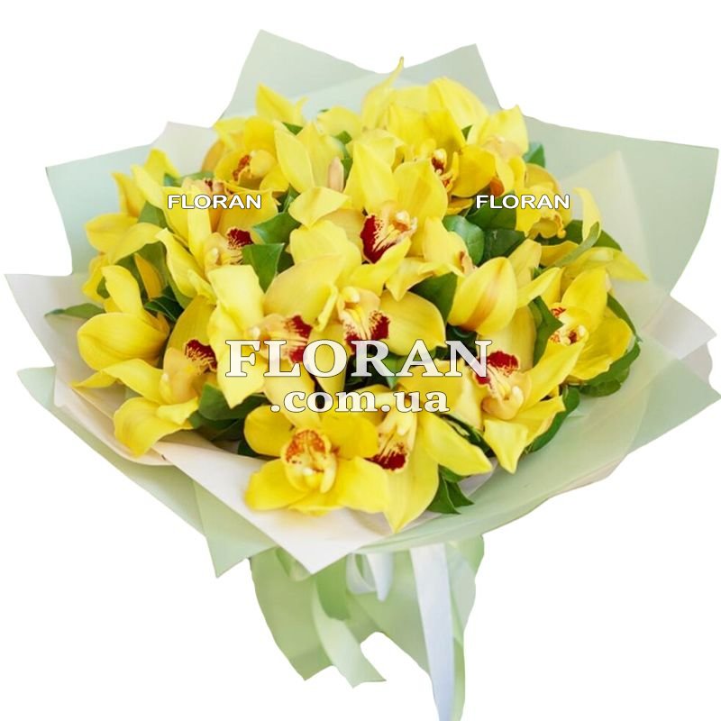 Bouquet of yellow orchids - product code FL-1617 - is a bright and sunny manifestation of love, joy and energy. The yellow color of orchids symbolizes joy, optimism and friendliness. This bouquet will be a real embodiment of happiness and freshness, which are transferred to others. He will give warmth and a smile, filling the day with light and joy. A bouquet of yellow orchids is perfect for a gift to a girlfriend, sister, colleague or any other special person whom you want to please and bring brightness and sunshine into his life. Our store is ready to provide delivery of bouquets of yellow orchids to any city in Ukraine. We understand that your bouquet must be delivered on time and in perfect condition to bring joy and satisfaction to the recipient. Our team of experienced couriers takes care of every detail of the delivery, keeping your bouquet safe and fresh. Regardless of where the recipient is located - in Kiev, Kharkov, Odessa, Lvov or in any other city in Ukraine, we guarantee that your bouquet of yellow orchids will be delivered on time and will lead to sincere joy and admiration. You can place an order on our website, specifying the date and address of delivery, and we will be happy to deliver your bouquet to create beautiful moments and memorable emotions.