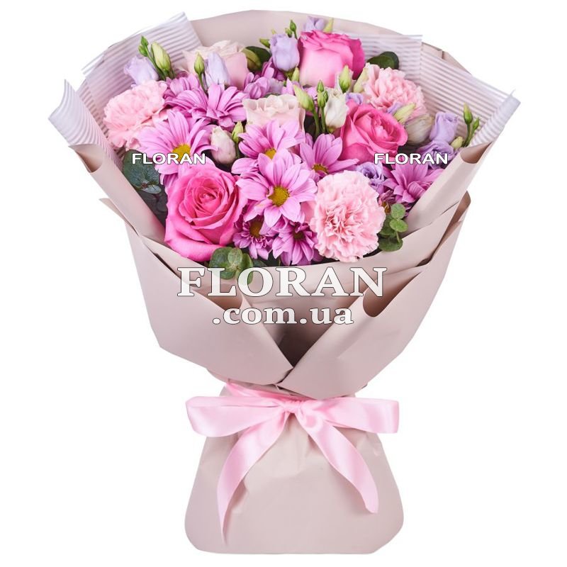 This bouquet with roses, chrysanthemums, carnations and eustoma will be a wonderful gift for various events and holidays. It combines tenderness, freshness and a variety of colors, which adds a special charm to it.