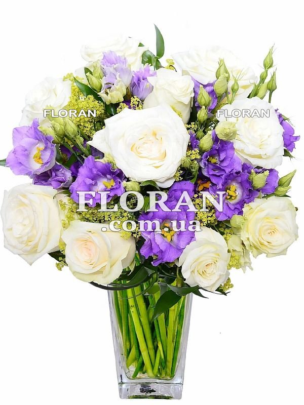 Bouquet with eustoma and rose - product code FL-1139, consisting of 11 white roses and 6 purple eustomas, creates an interesting contrast and an attractive combination of colors. White roses symbolize purity, tenderness and endless love, while purple eustoma adds sophistication and mystery to the bouquet. The contrast between white roses and purple eustoma creates an impression of harmony and elegance. White roses are a classic choice for a wedding, embodying purity and purity. The purple color of eustoma symbolizes mystery and luxury. This contrasting bouquet will draw attention and be a great addition to your wedding attire, especially if the main color scheme of the wedding includes purple tones.